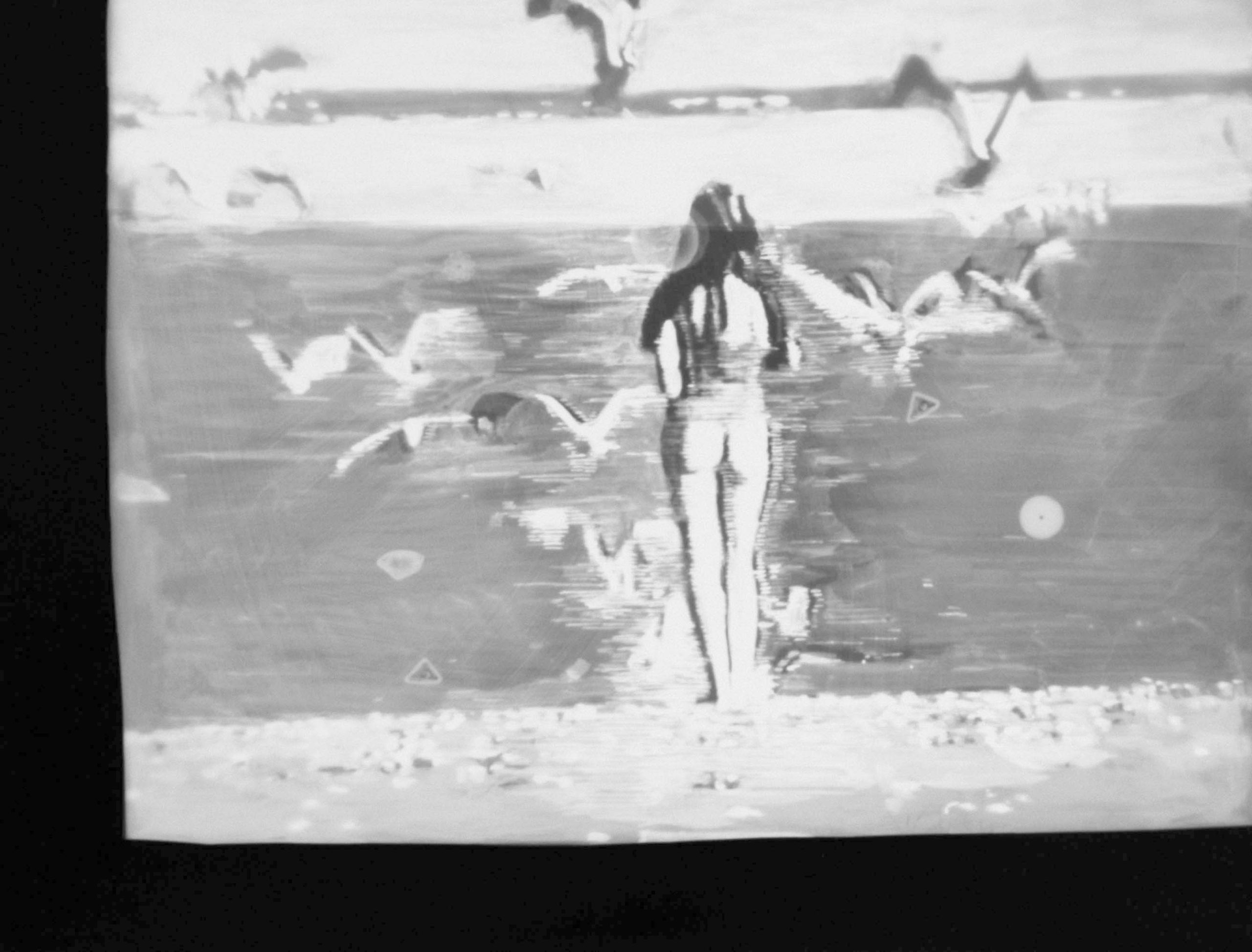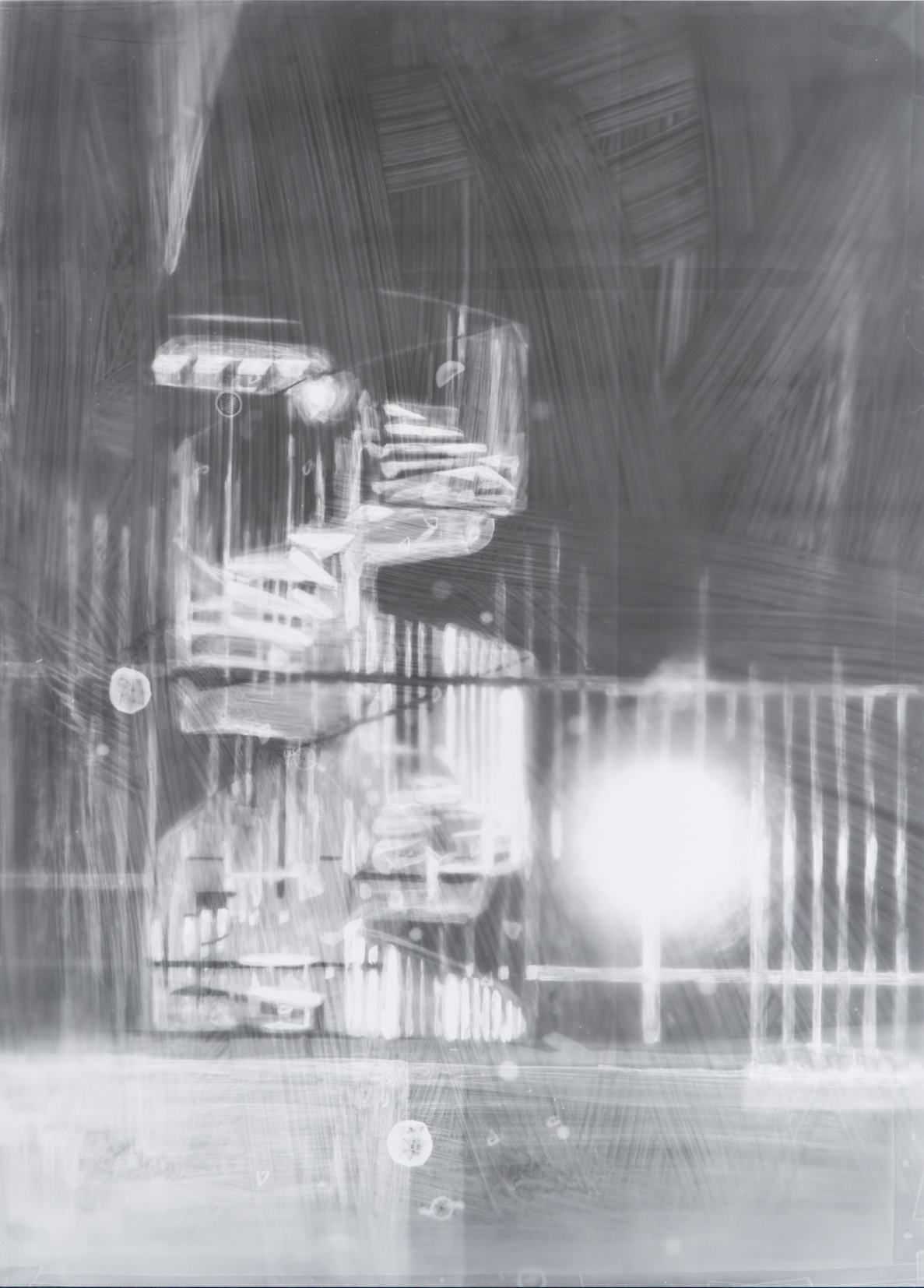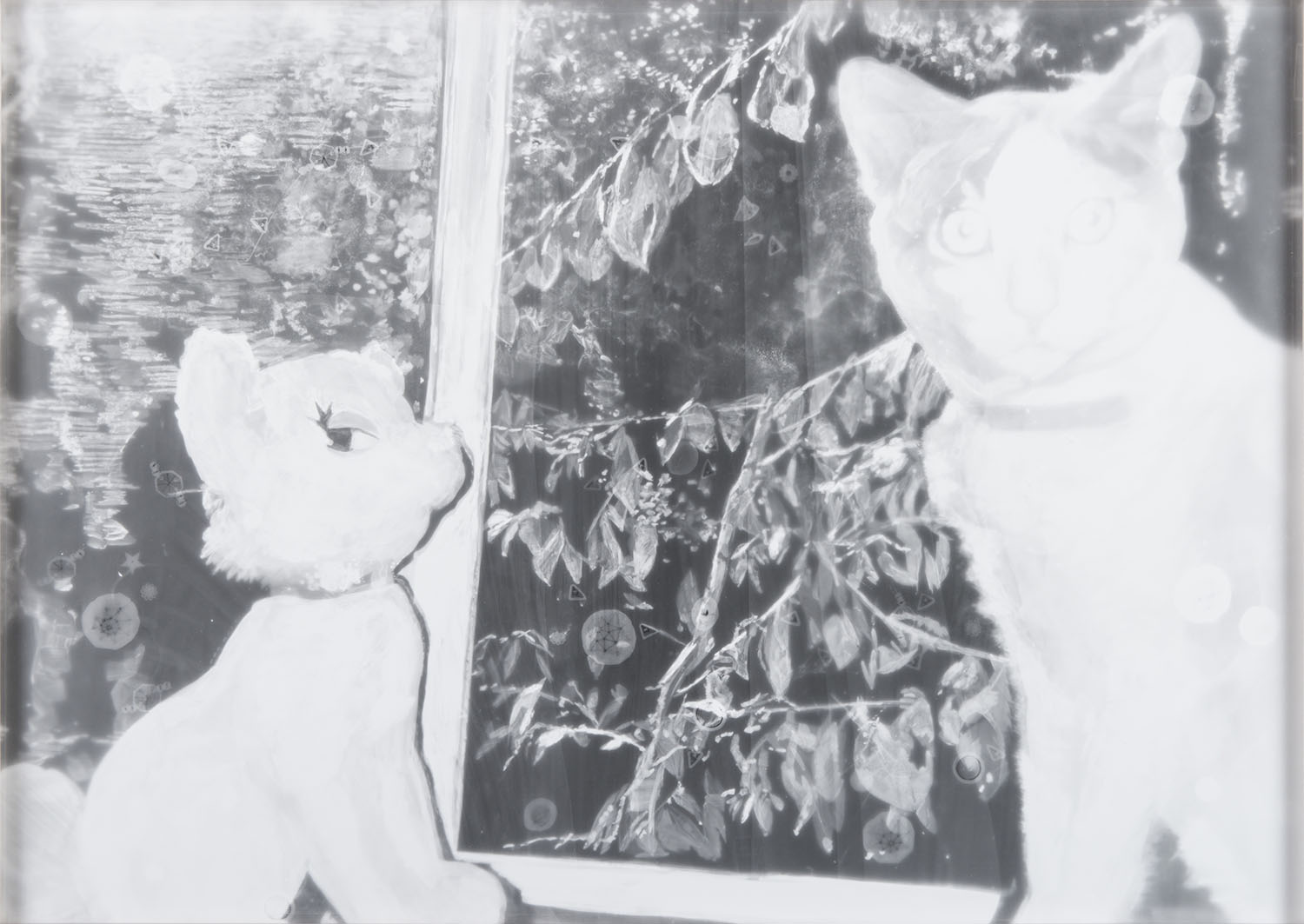 人々が共有してきた無数の像に触れる手段として、三宅が長年取り組んできた手法がフォトグラムです。その多くは、さまざまな経緯で出会った既存の画像をモチーフに、透明シートに複数のドローイングを描き、感光紙の上に重ね合わせて露光し、ドローイングの影を現像するというプロセスで制作されていきます。「影」というイメージの起源にまで遡って思考しつつ、画像の組成を裏側から探るような手法で生み出される作品群は、メディアのあいまいな広がりと、イメージの深層へといざなうような奥行きを有しています。また近年は、フォトグラムの制作を通して深めた思索を反映させた映像作品や、ファウンドオブジェを配置した作品にも取り組み、誰しもの眼差しに内在する「絵画的な像」を抽出するという彼女の試みは新たな表現の幅を広げ、私的でありながら同時に社会的でもあるわたしたちの存在を多声的に浮かび上がらせます。