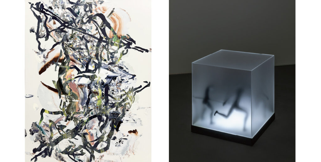 Right: “turning around and around”, 2022, clay,acrylic,paint,LED light,acrylic,box,steel, H500×W460×D460mm