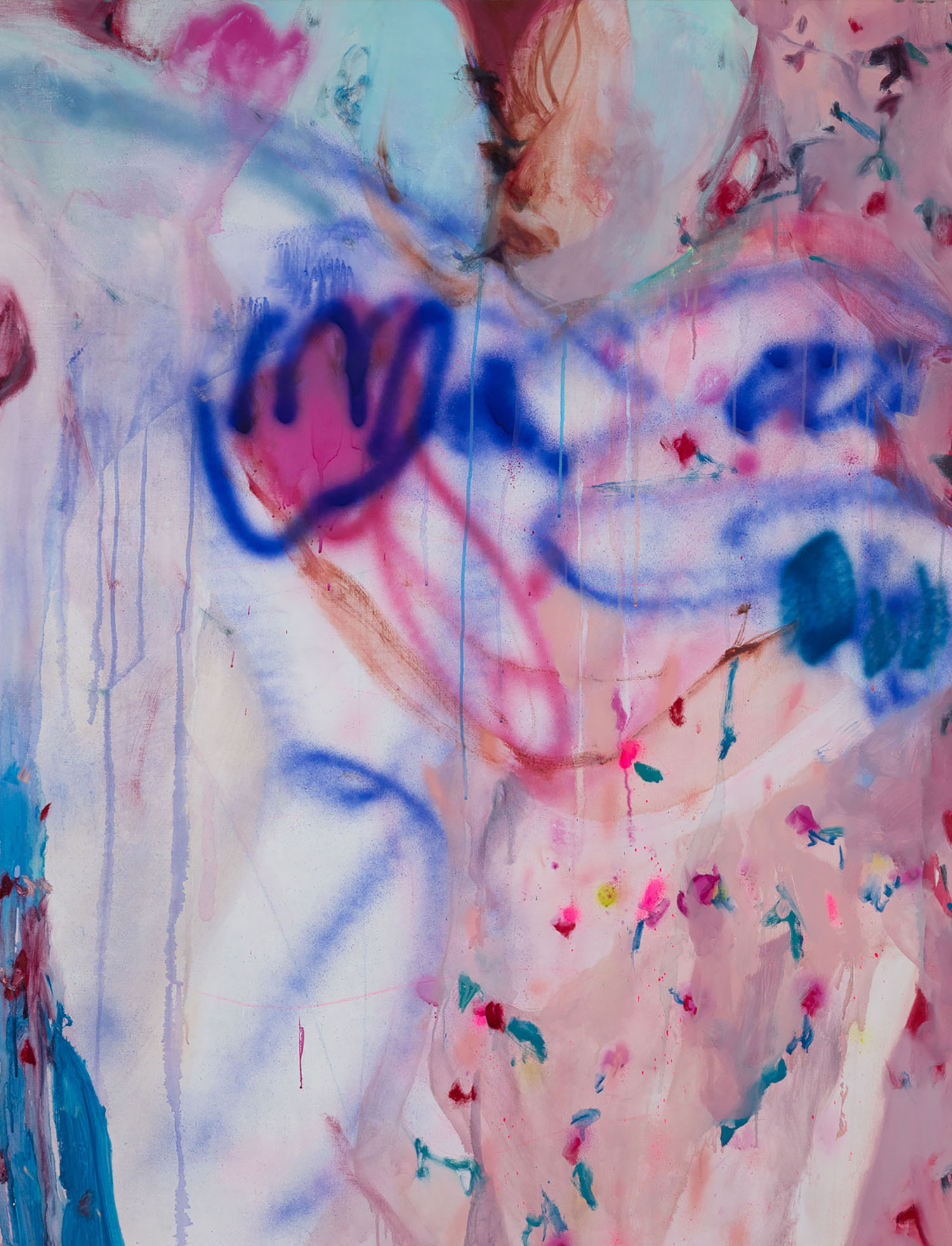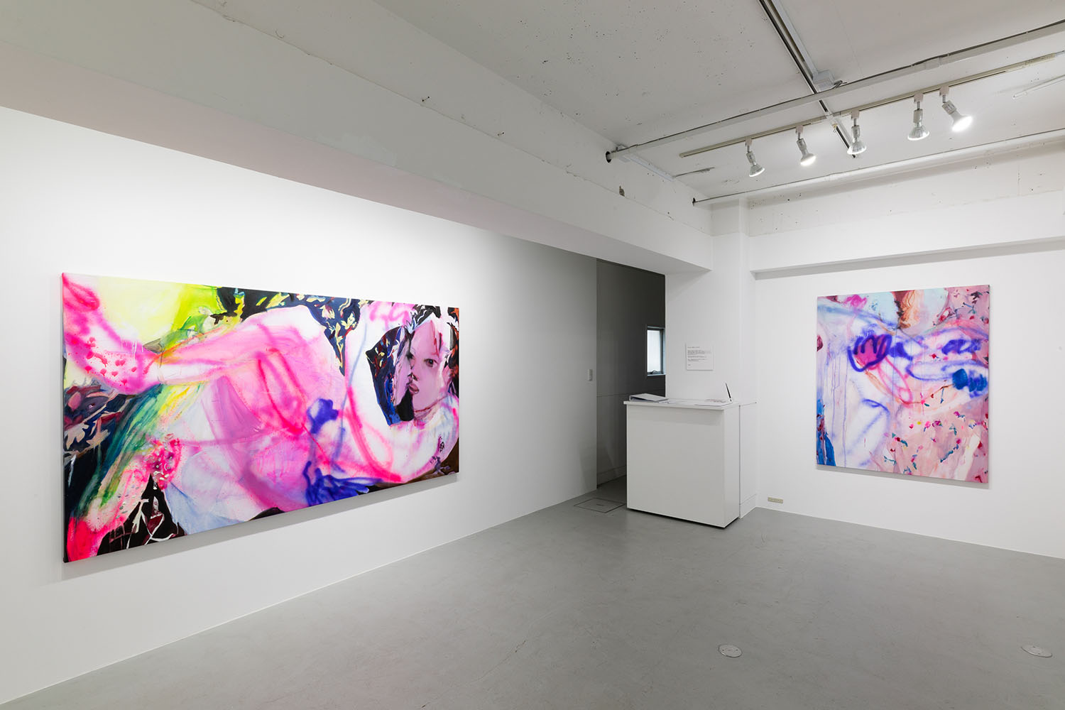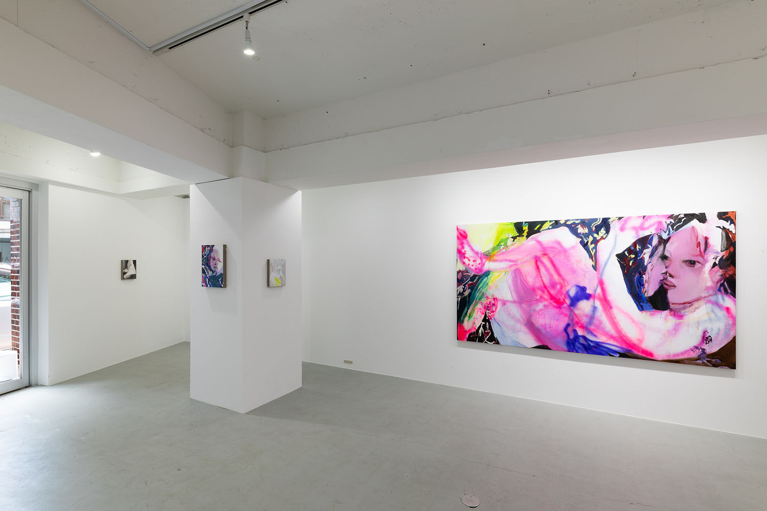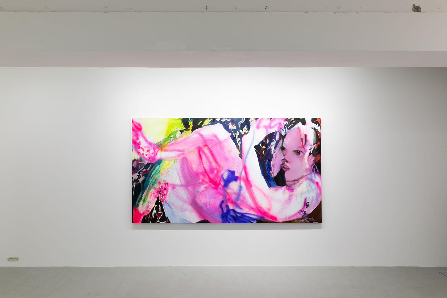 Tsuchitori has always had a strong interest that a person chooses one thing and cares about it. The title of this exhibition, “Bones and Skin,” refers to the structure of the paintings as if they were the body. The various brush strokes, such as touching the canvas like the skin of the painting with a brush, painting without touching with lacquer spray, or rubbing with a crayon, can be replaced by variations of the act of expressing one’s feelings about people and things. The motif of “two people in close proximity” as depicted by Tsuchitori has existed many times in the history of art. Art Nouveau painter Gustav Klimt introduced the glittering decorative arts, which had been subordinated to the fine arts, into his portraits, depicting opulence and eroticism. Tsuchitori’s work is also positioned in the lineage of paintings with decorative patterns and figures, such as Klimt’s masterpiece “The Kiss”. However, Tsuchitori always paints decorations and motifs that she has actually “seen” in her daily life or on the Internet, to bring a sense of everydayness rather than opulence to her paintings. The act of “seeing” may seem like a shareable sensation, but it is actually a very personal act. In this respect, “seeing” is the beginning of a personal attachment to an object. In other words, the paintings are an expression of Tsuchitori’s act of looking itself, and also a disclosure of her feelings. Felix Gonzalez-Torres expressed his personal love with a sculpture of everyday objects such as candies and cookies piled up to the weight of his deceased partner. The expression of “feelings” through seeing and touching, and through everyday objects in Tsuchitori’s paintings, can be functioned like a larger vessel, capable of projecting a sense of love that we can all share.