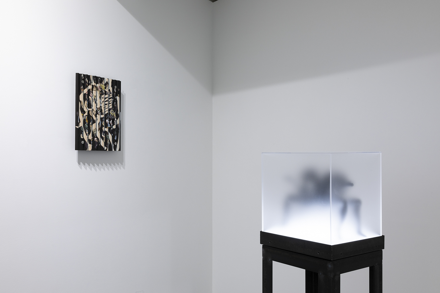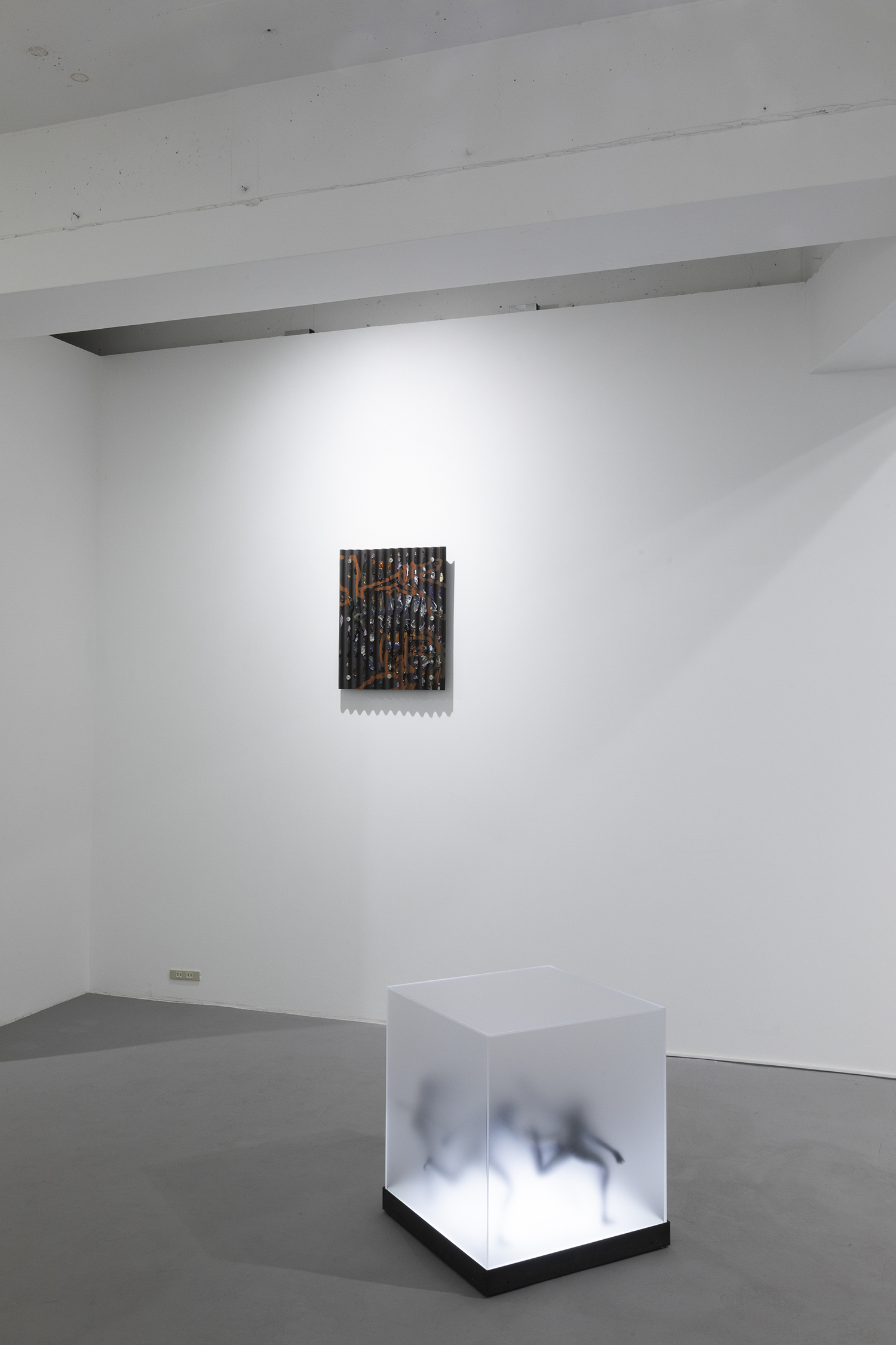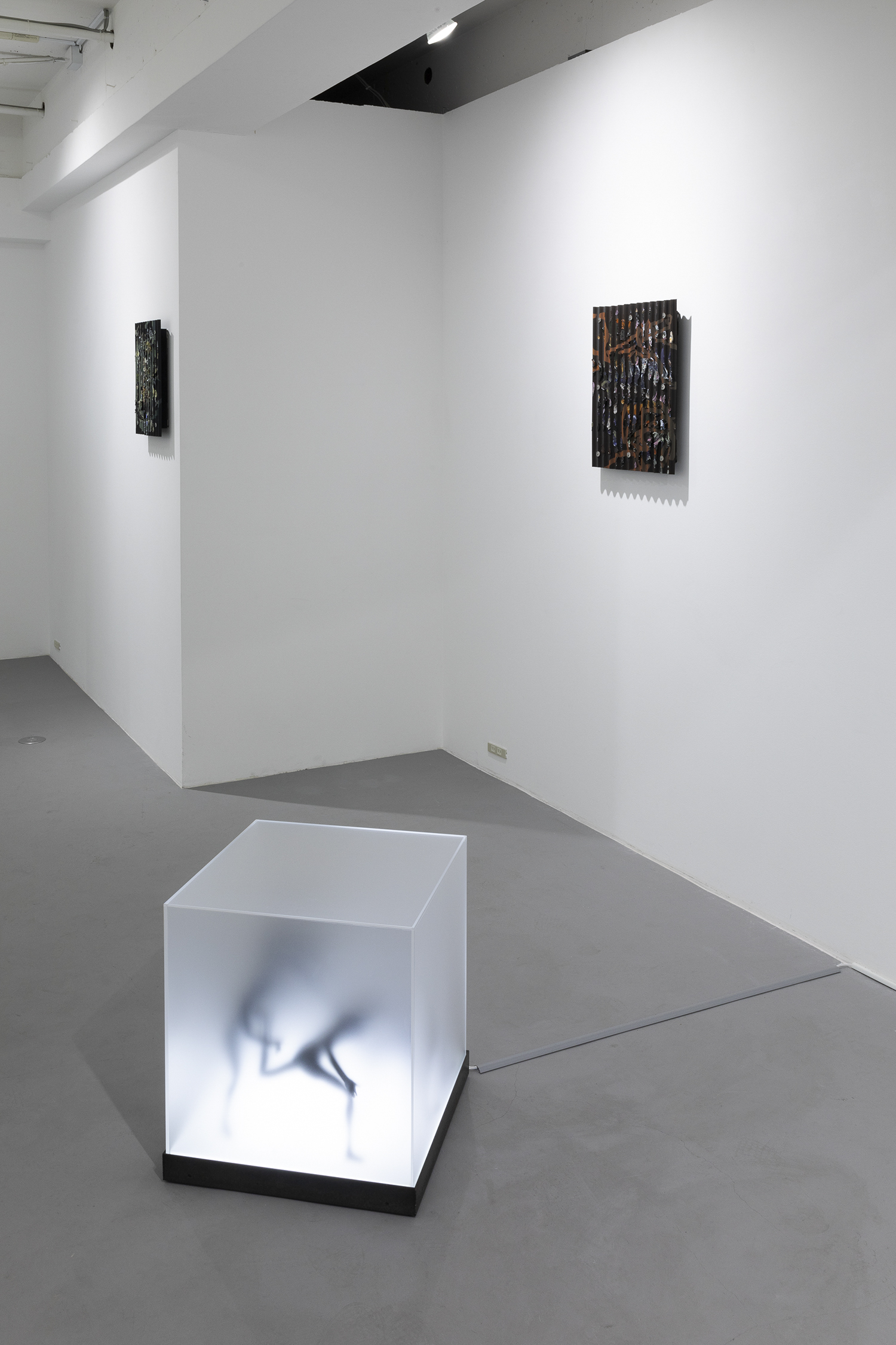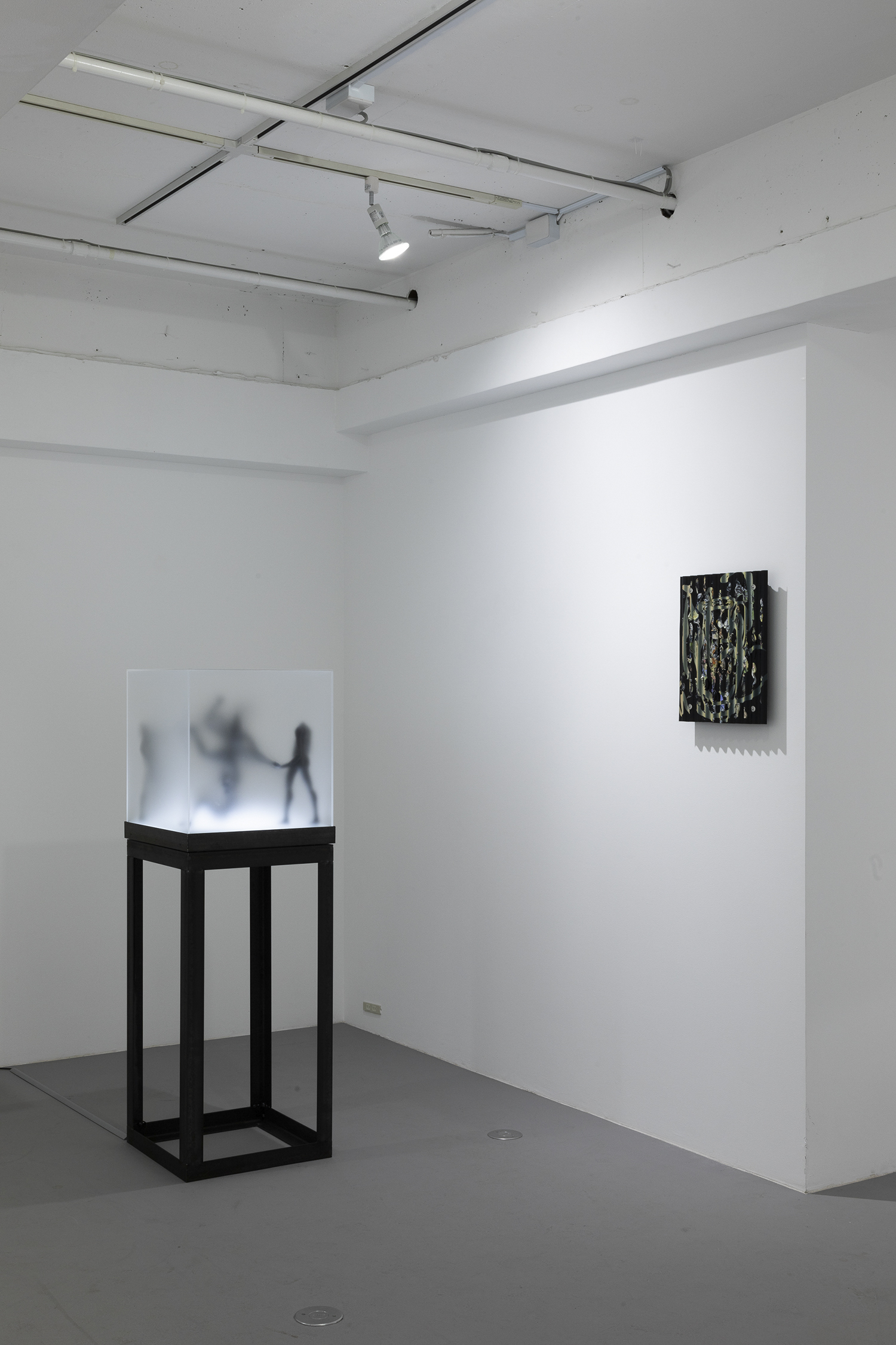 “Two Sorrows”(detail), 2022, clay, acrylic paint, LED light, acrylic box, steel, H356×W310×D310mm