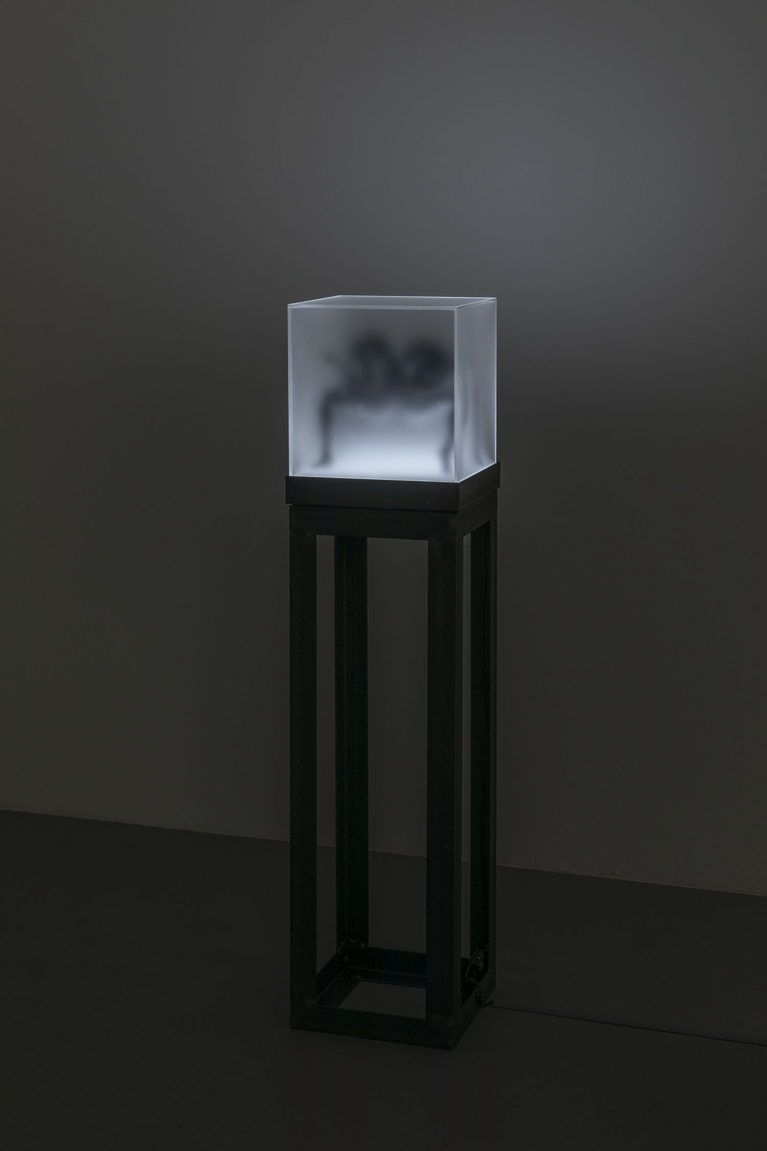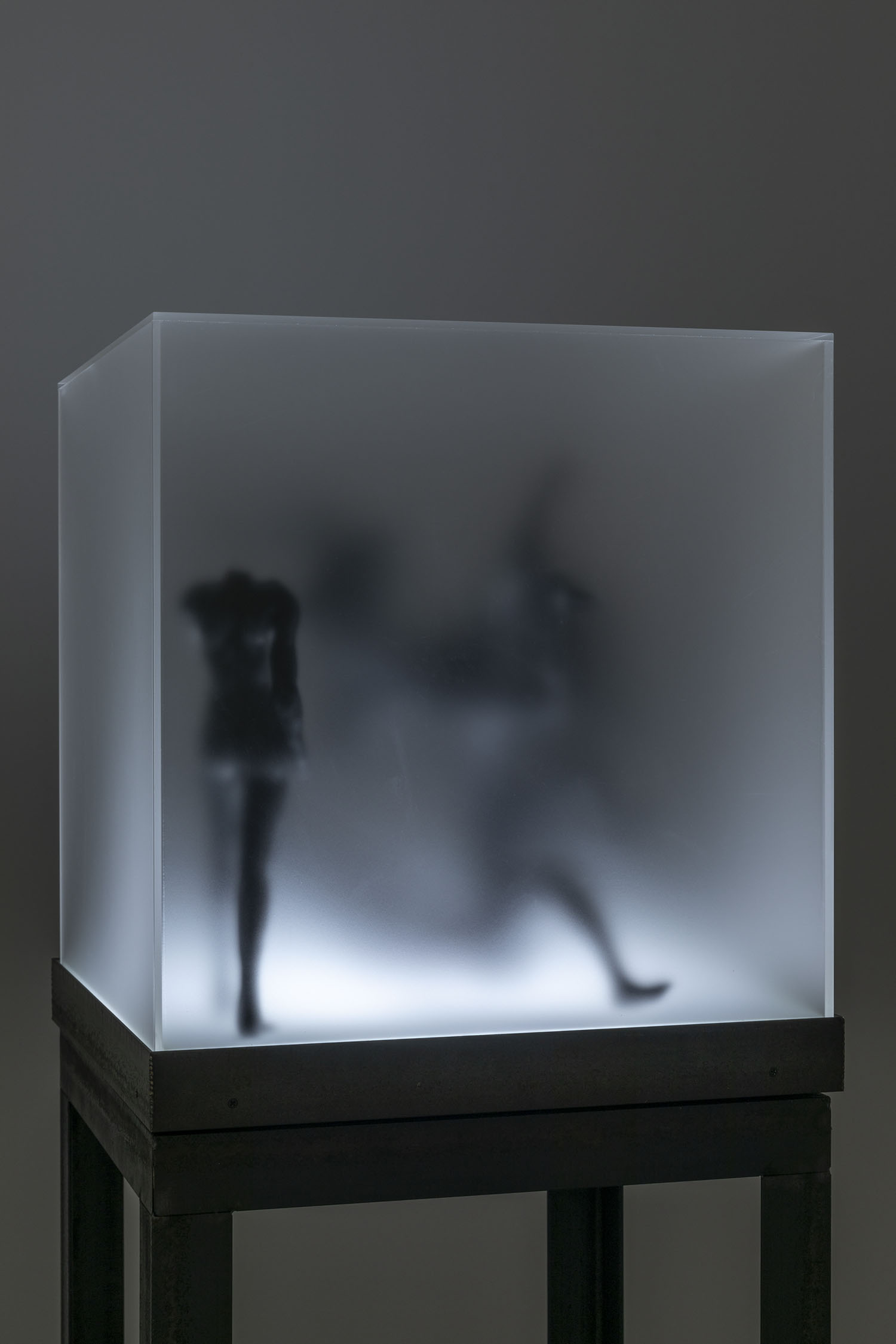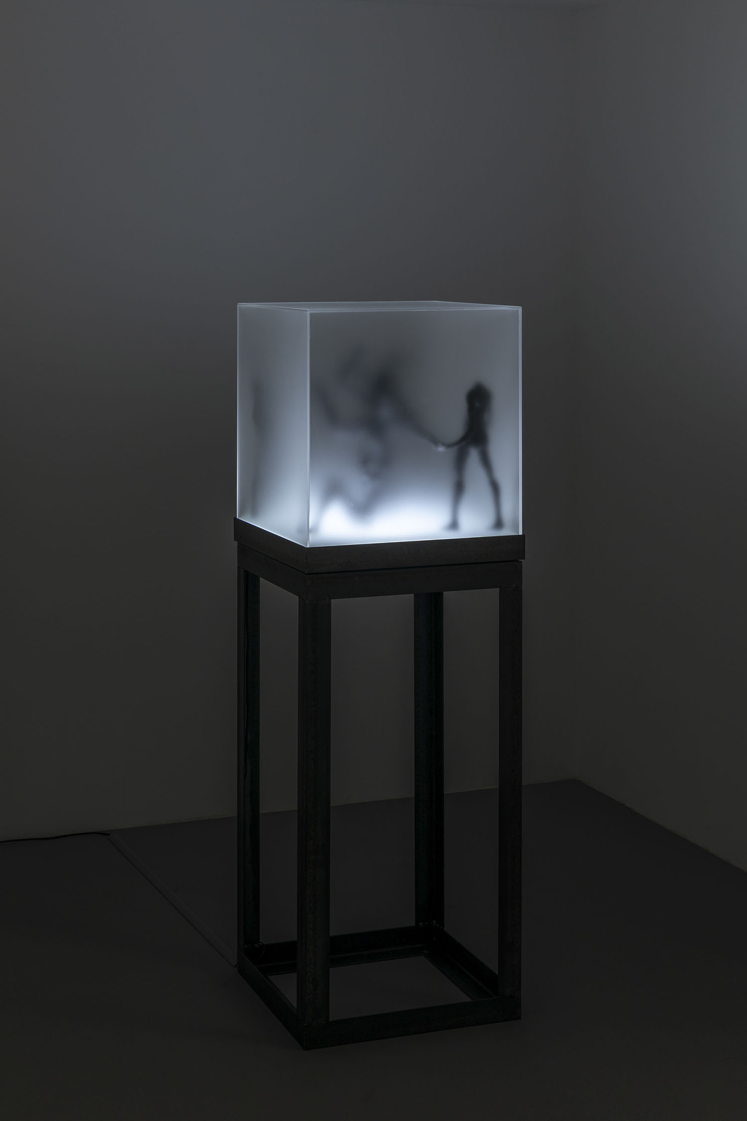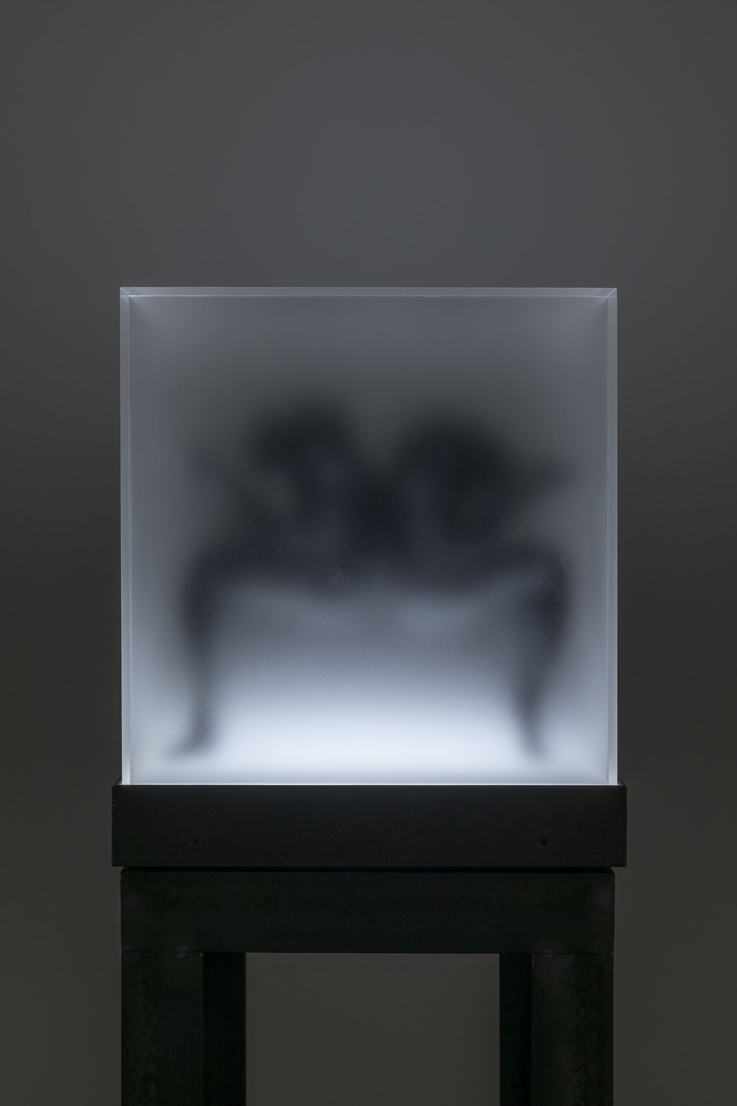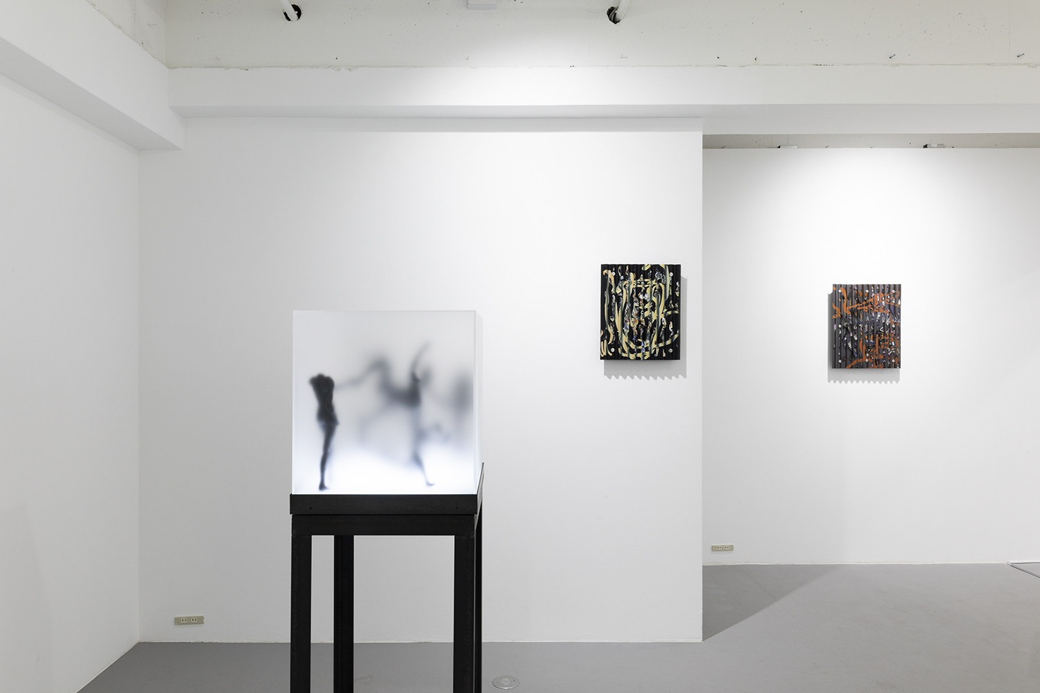 “Two Sorrows”(detail), 2022, clay, acrylic paint, LED light, acrylic box, steel, H356×W310×D310mm