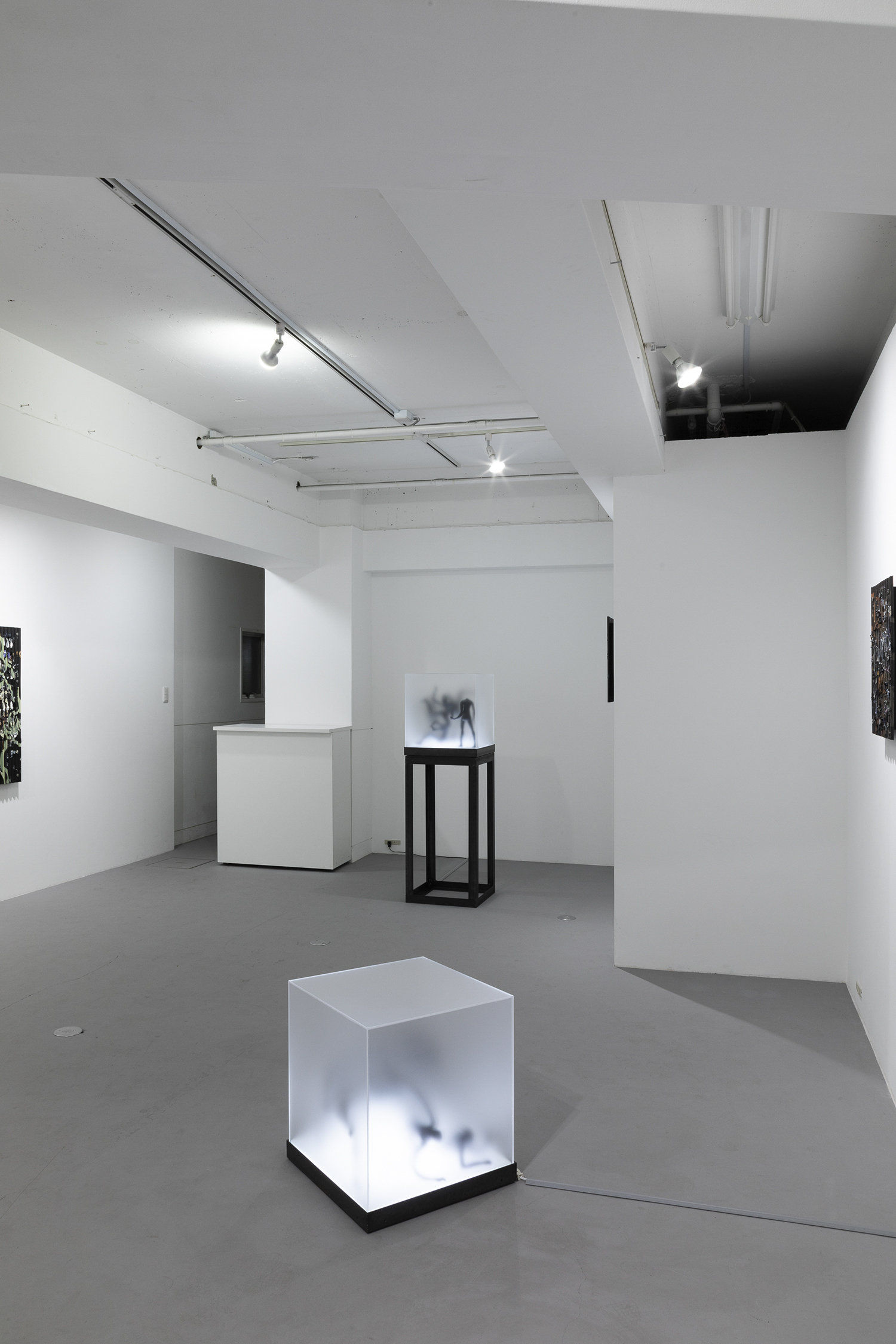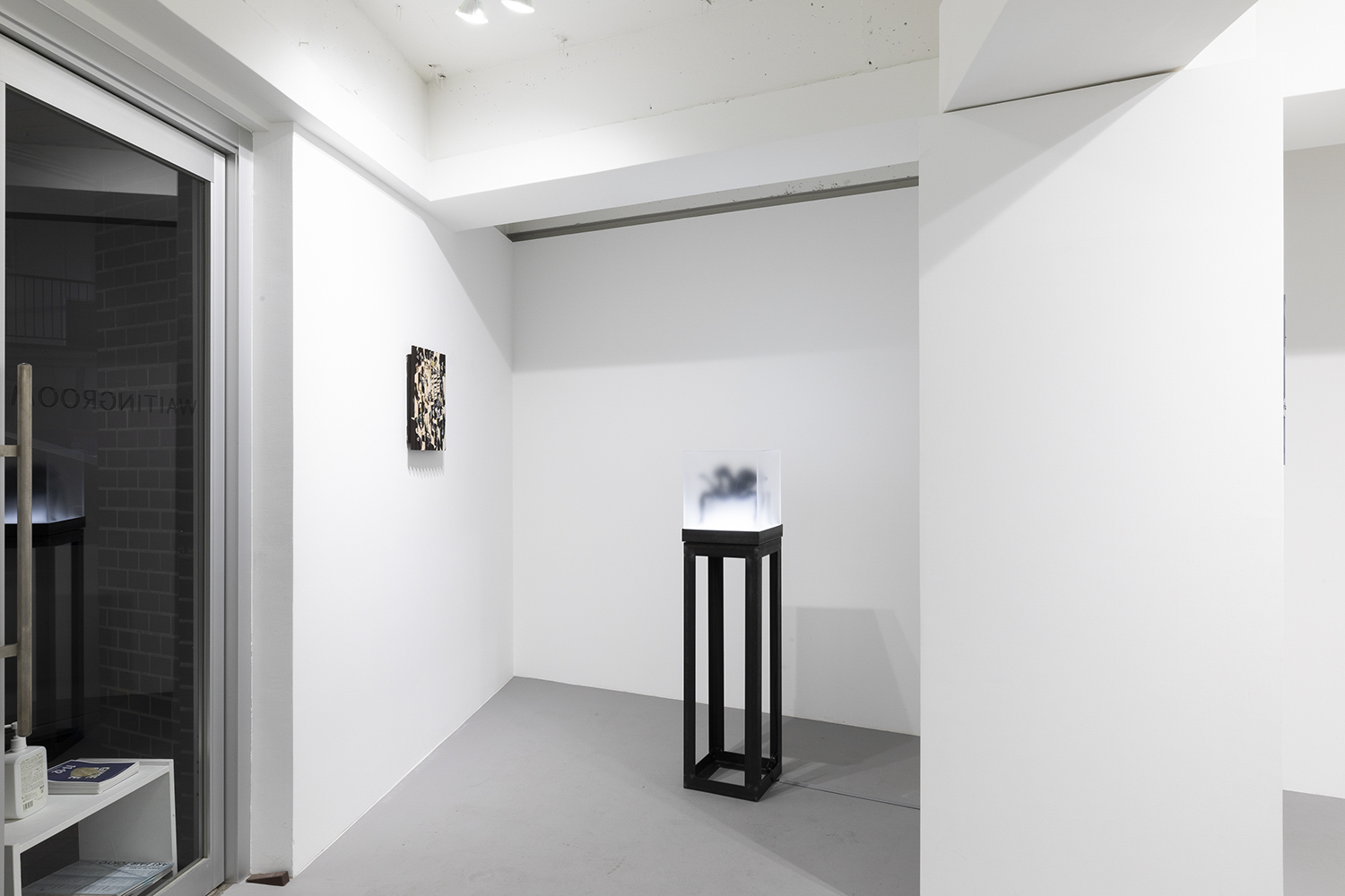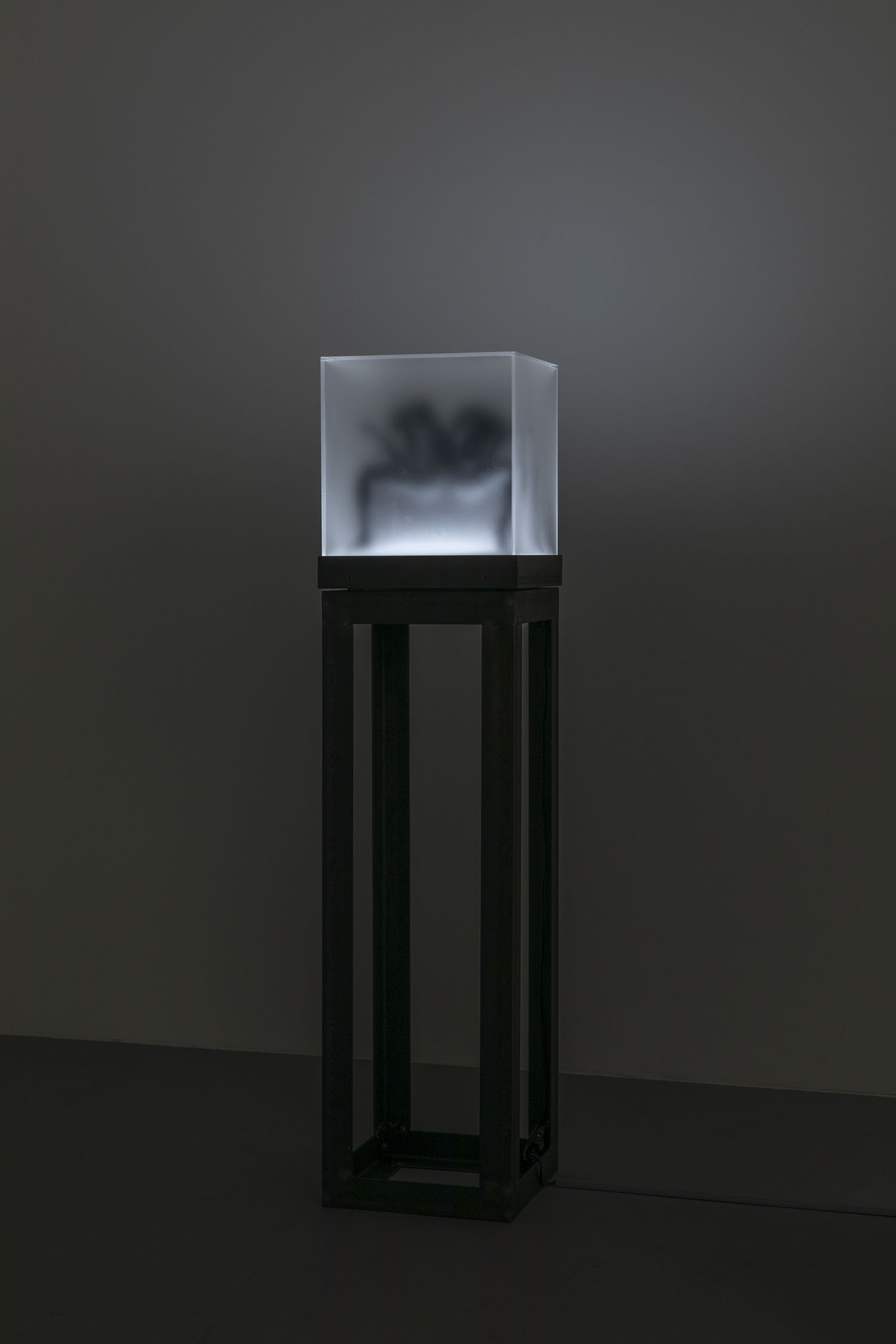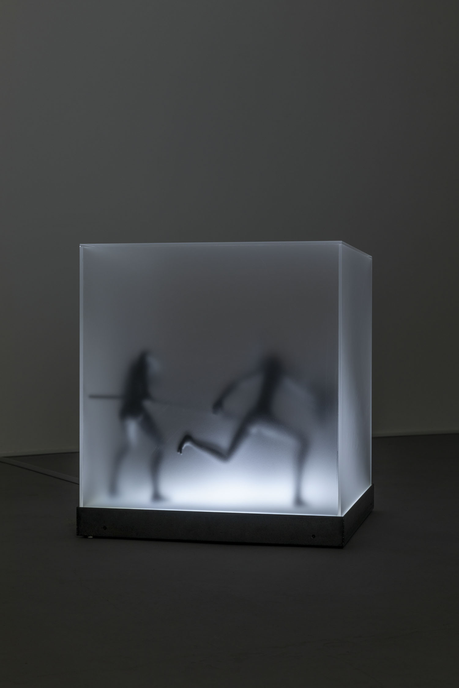 “Two Sorrows”(detail), 2022, clay, acrylic paint, LED light, acrylic box, steel, H356×W310×D310mm