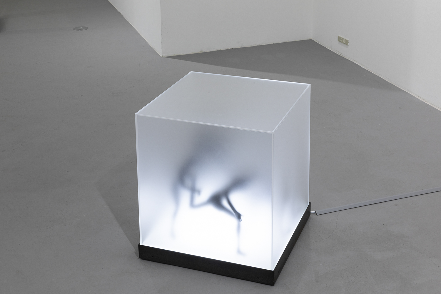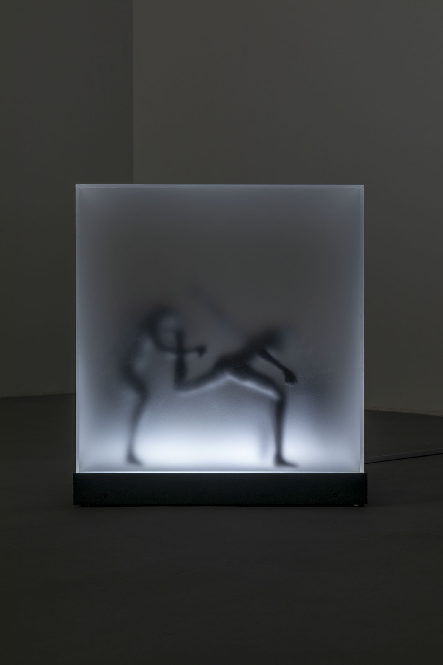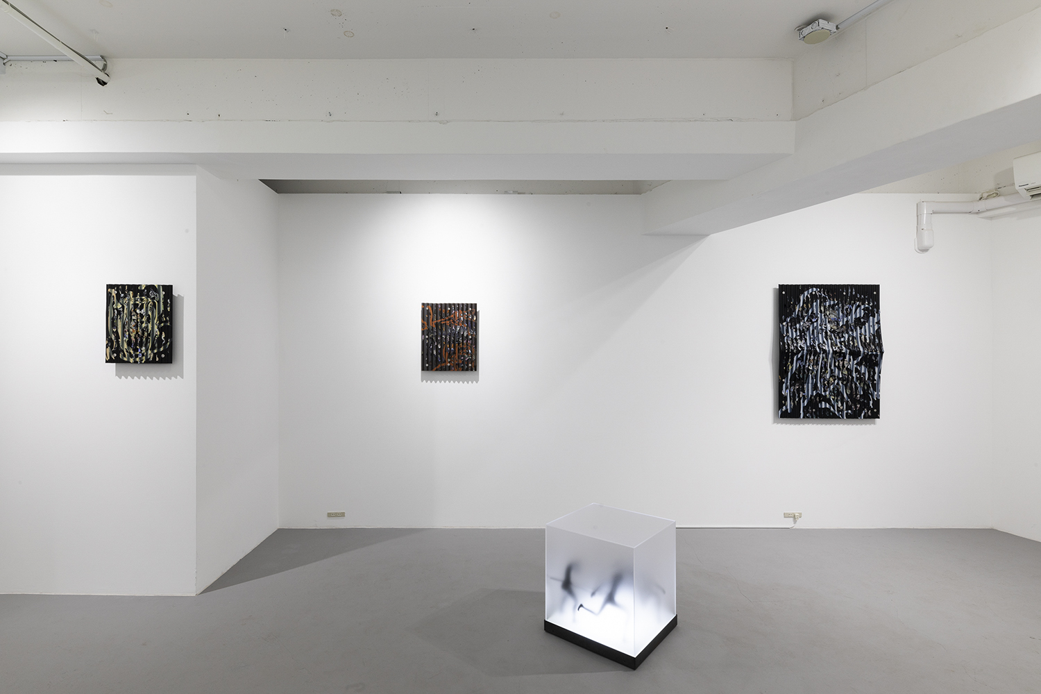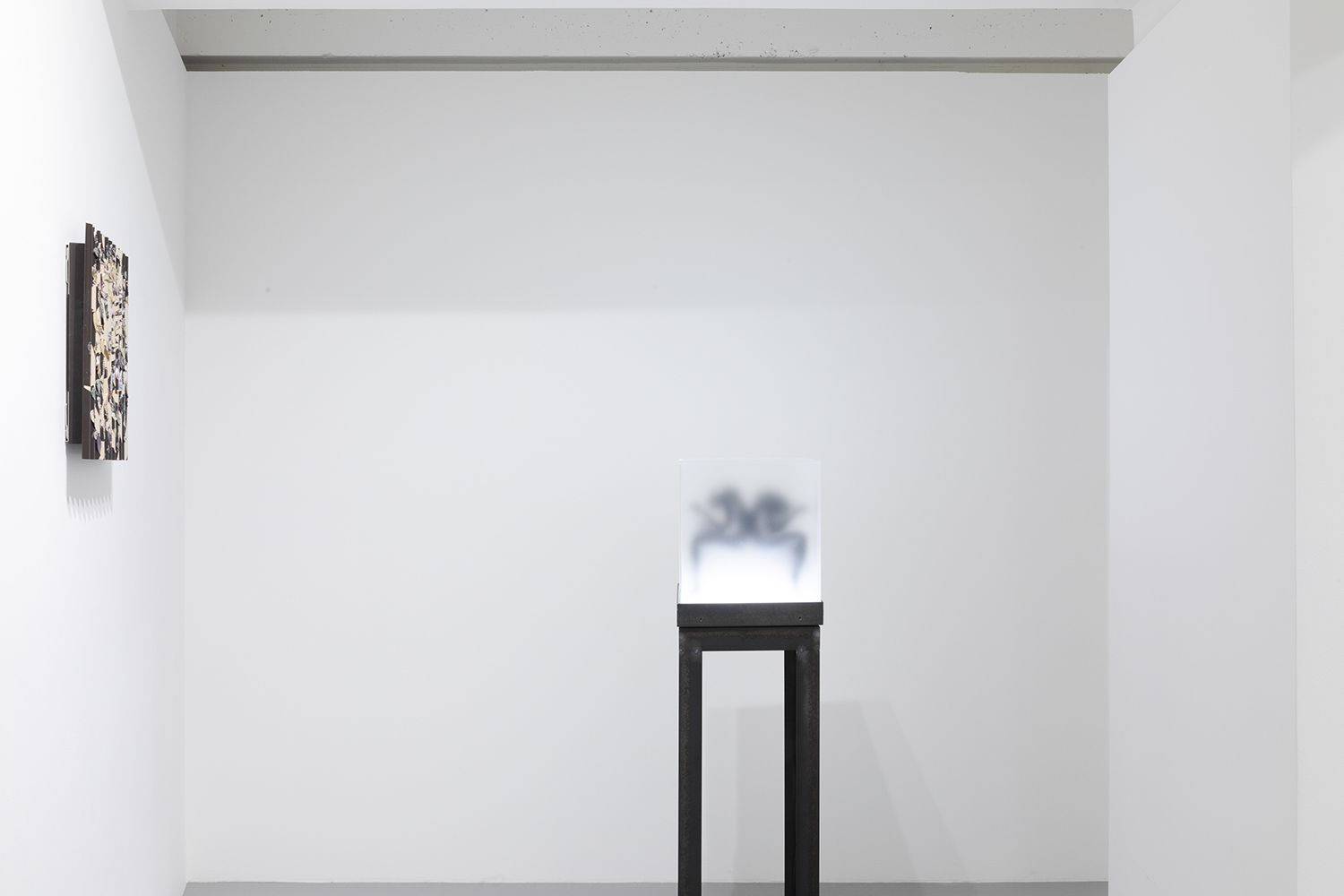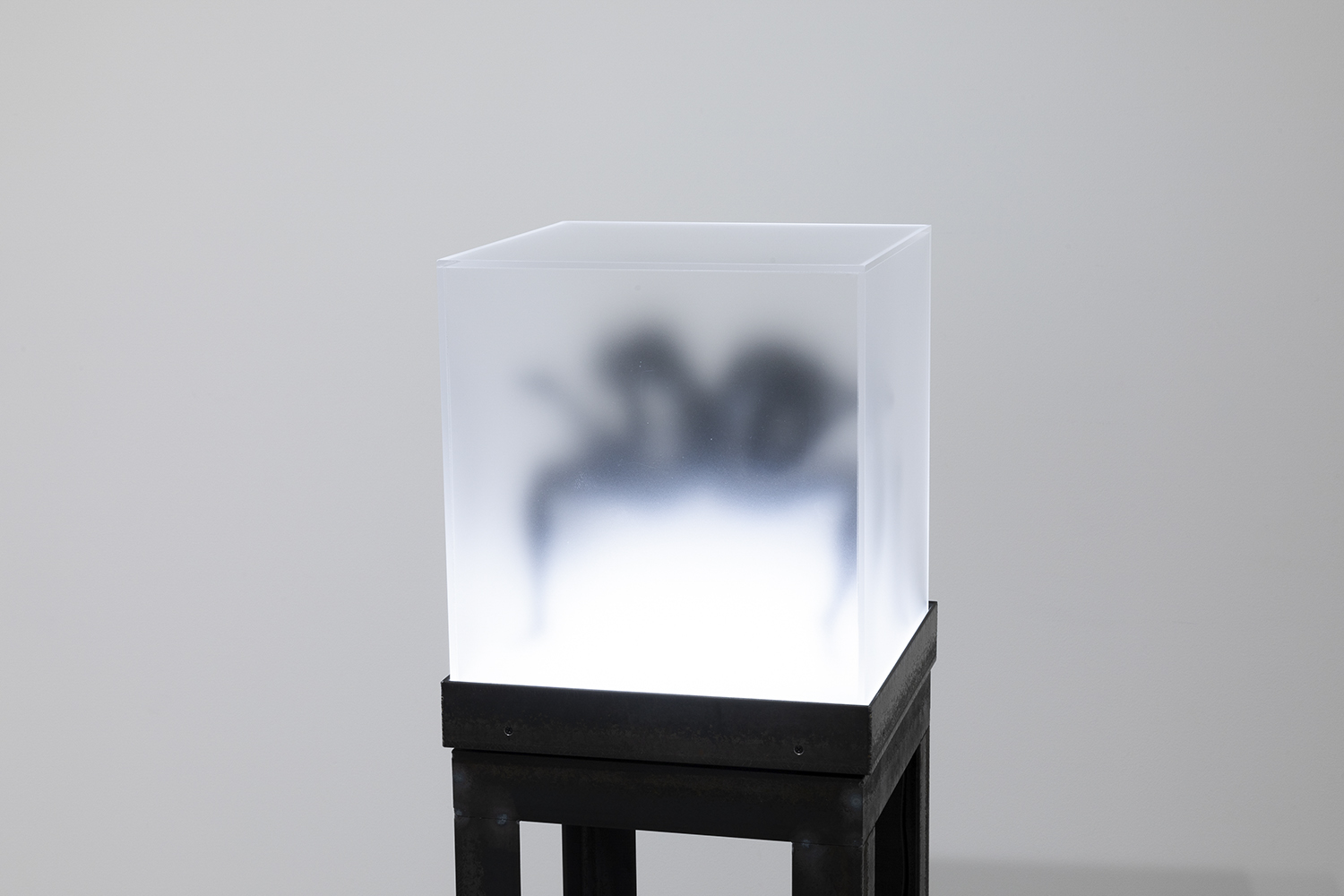 “Two Sorrows”(detail), 2022, clay, acrylic paint, LED light, acrylic box, steel, H356×W310×D310mm