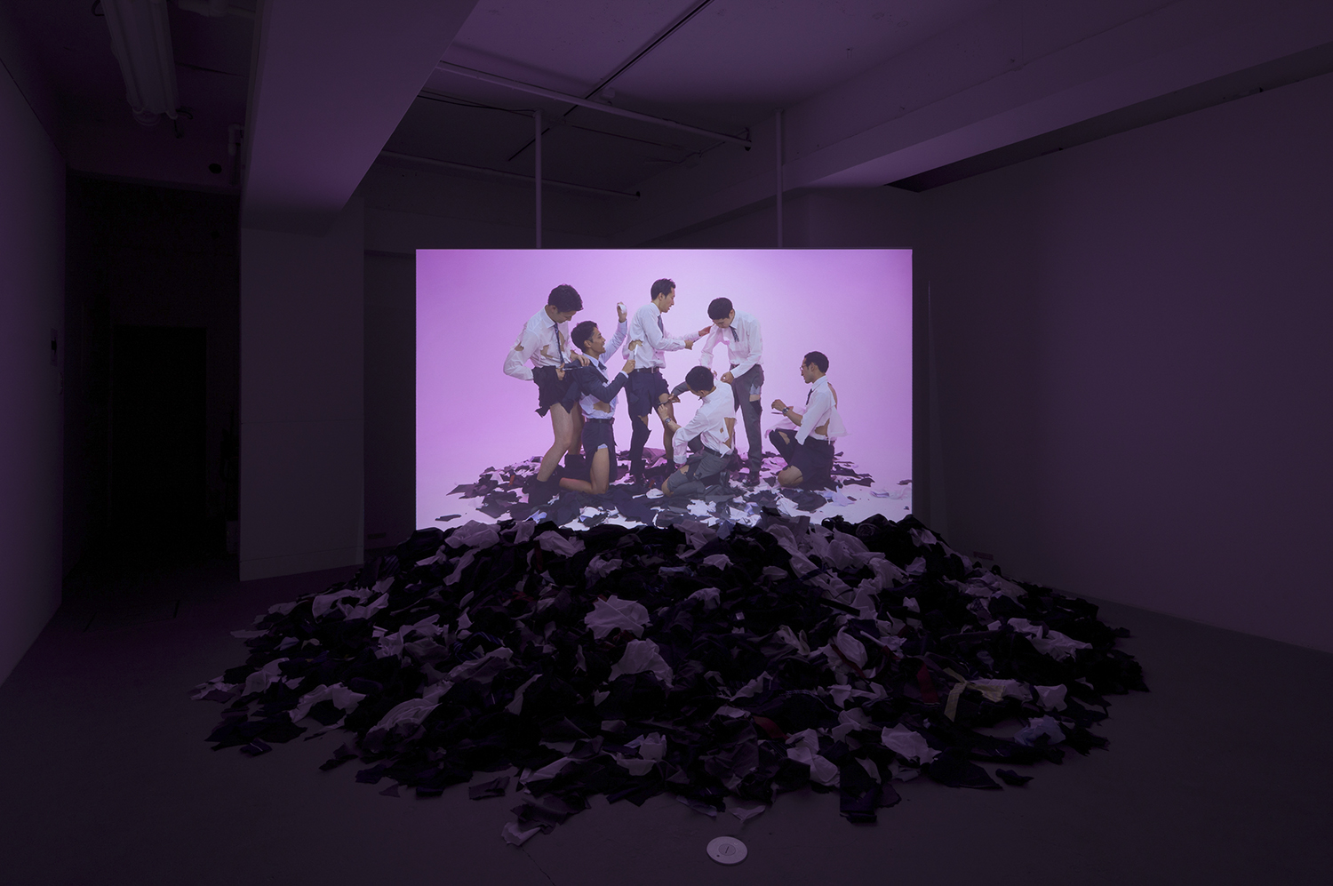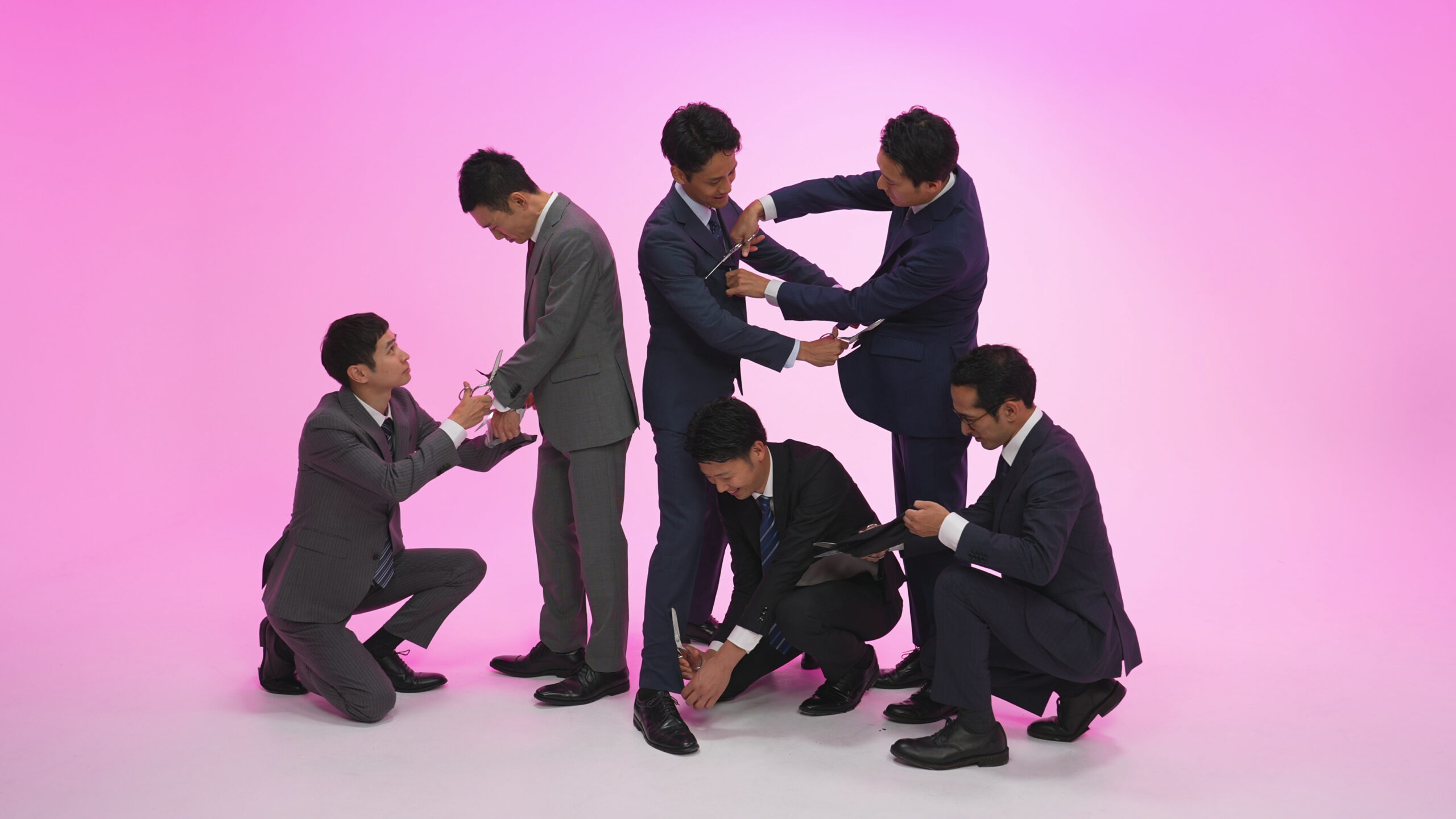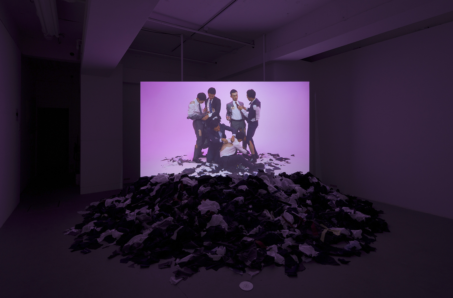 The fantastical stories of male subjects depicted in The Butterfly Dream are continued in Takata’s latest work Cut Suits, where men dressed like salarymen happily cut up each other’s suits and shirts with the pairs of scissors in their hands. While this seems to be an allusion to an eroticized glimpse of men in suits, it is also a kind of liberation from the social norms surrounding Japanese conceptions of masculinity.