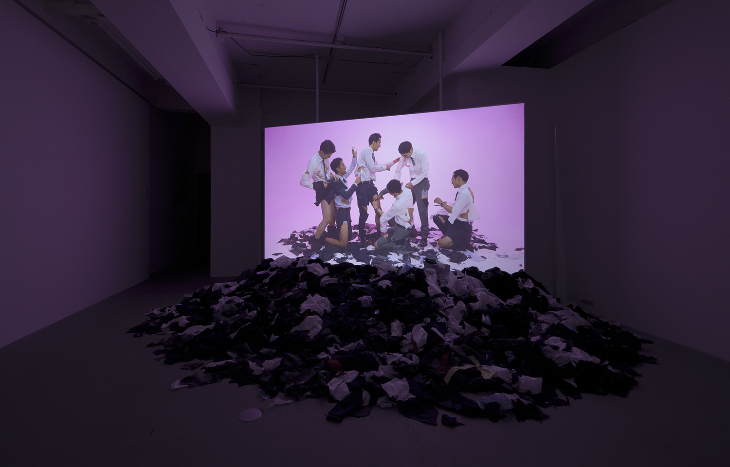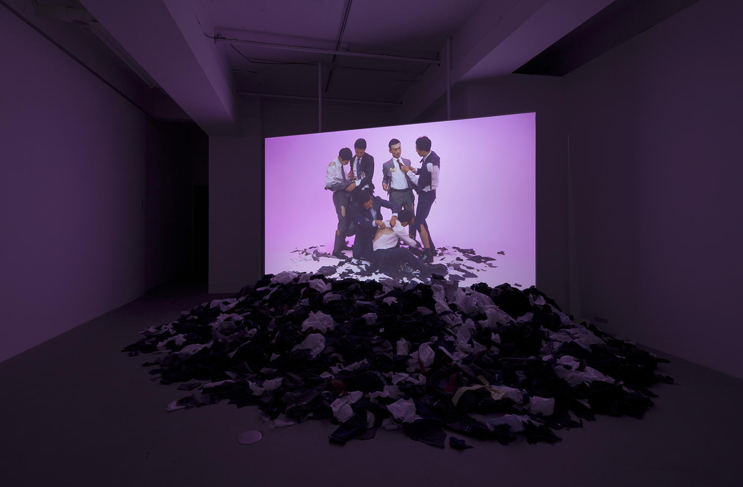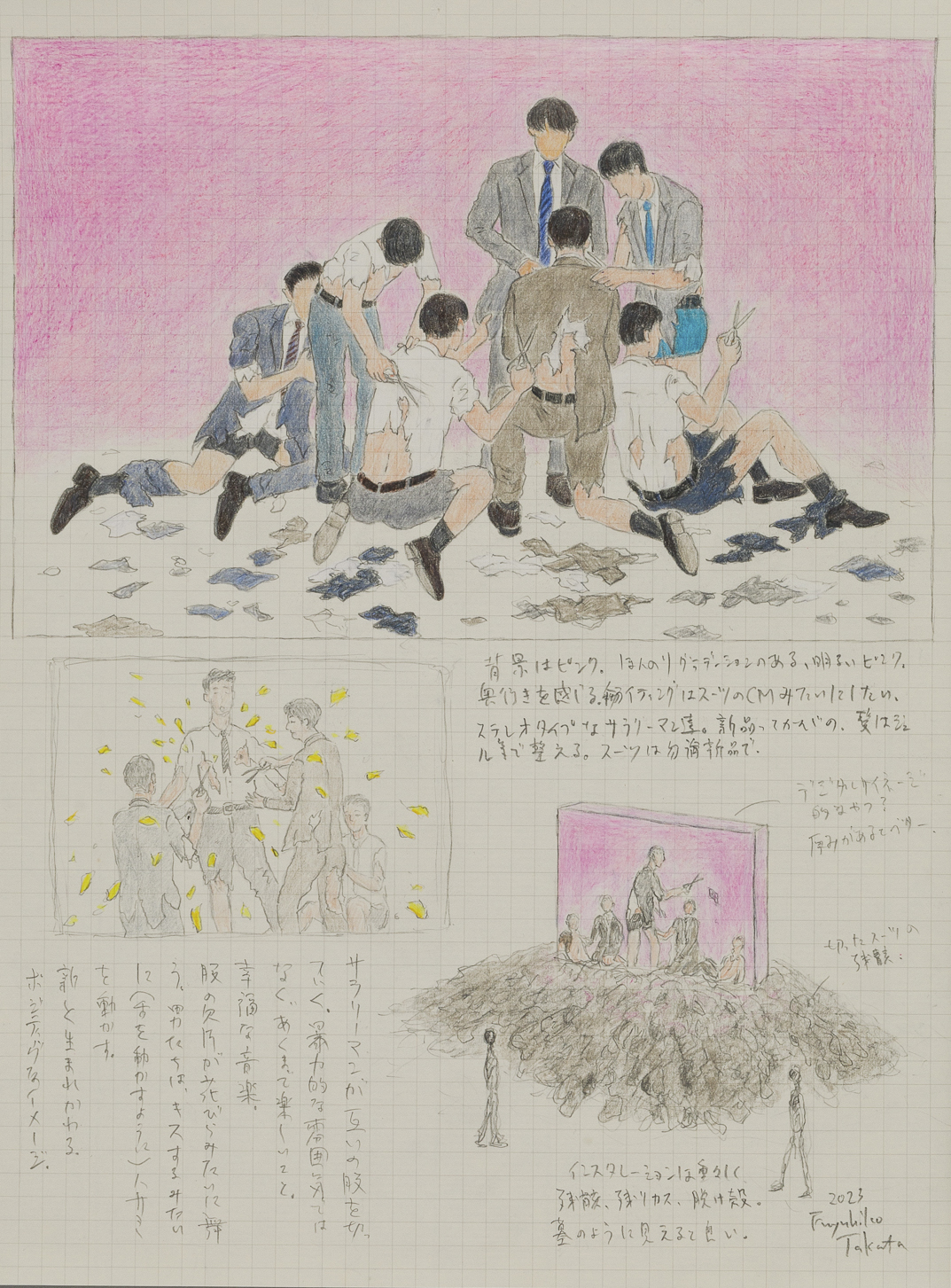 The fantastical stories of male subjects depicted in The Butterfly Dream are continued in Takata’s latest work Cut Suits, where men dressed like salarymen happily cut up each other’s suits and shirts with the pairs of scissors in their hands. While this seems to be an allusion to an eroticized glimpse of men in suits, it is also a kind of liberation from the social norms surrounding Japanese conceptions of masculinity.