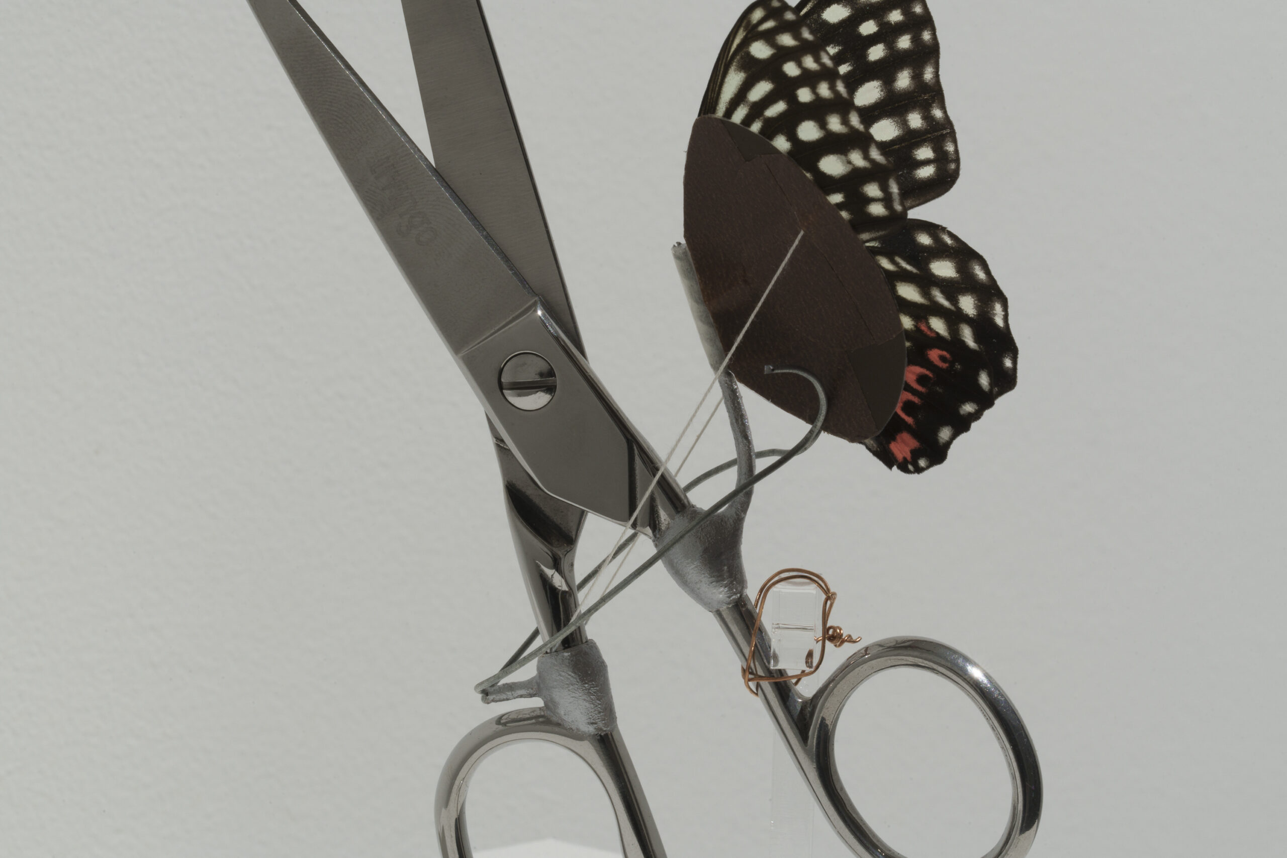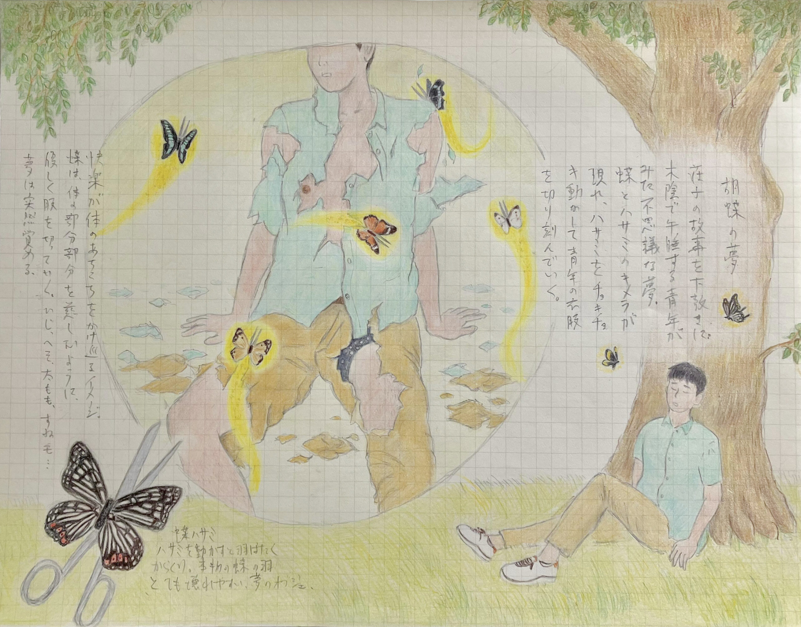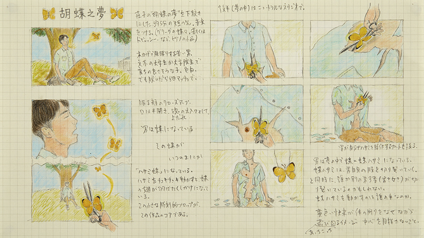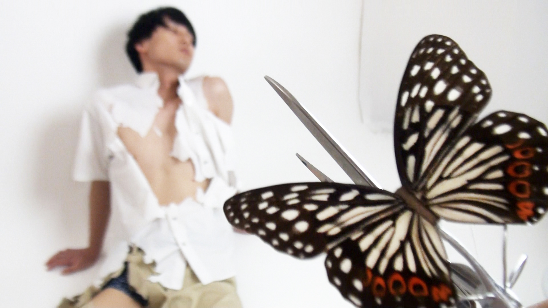 A young man is taking a nap in the shade of a tree, and in his dream, a chimera of a butterfly and a pair of scissors appears. The butterfly flits around the young man, and as soon as it flaps its wings, it moves the scissors and cuts through the young man’s clothes. The Butterfly Dream, which recalls the old Chinese tale by Zhuangzi, also makes references to Yoko Ono’s Cut Piece. This work, in which the assembled audience members take turns one by one to cut off the artist’s clothes with a pair of scissors, is well known as one of the earliest examples in the history of performance art that questioned the desire to “see/be seen,” and the problem of being active/passive.