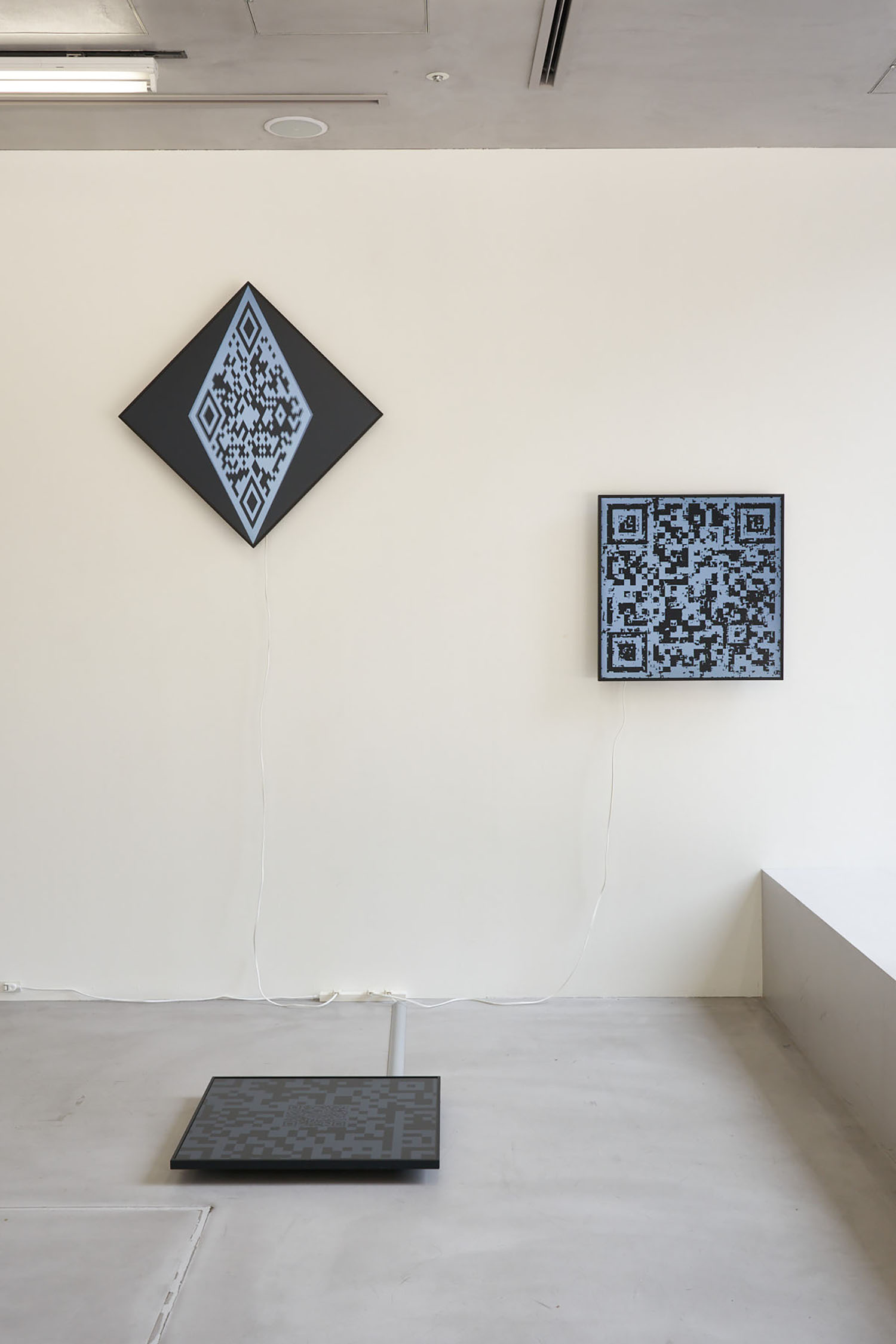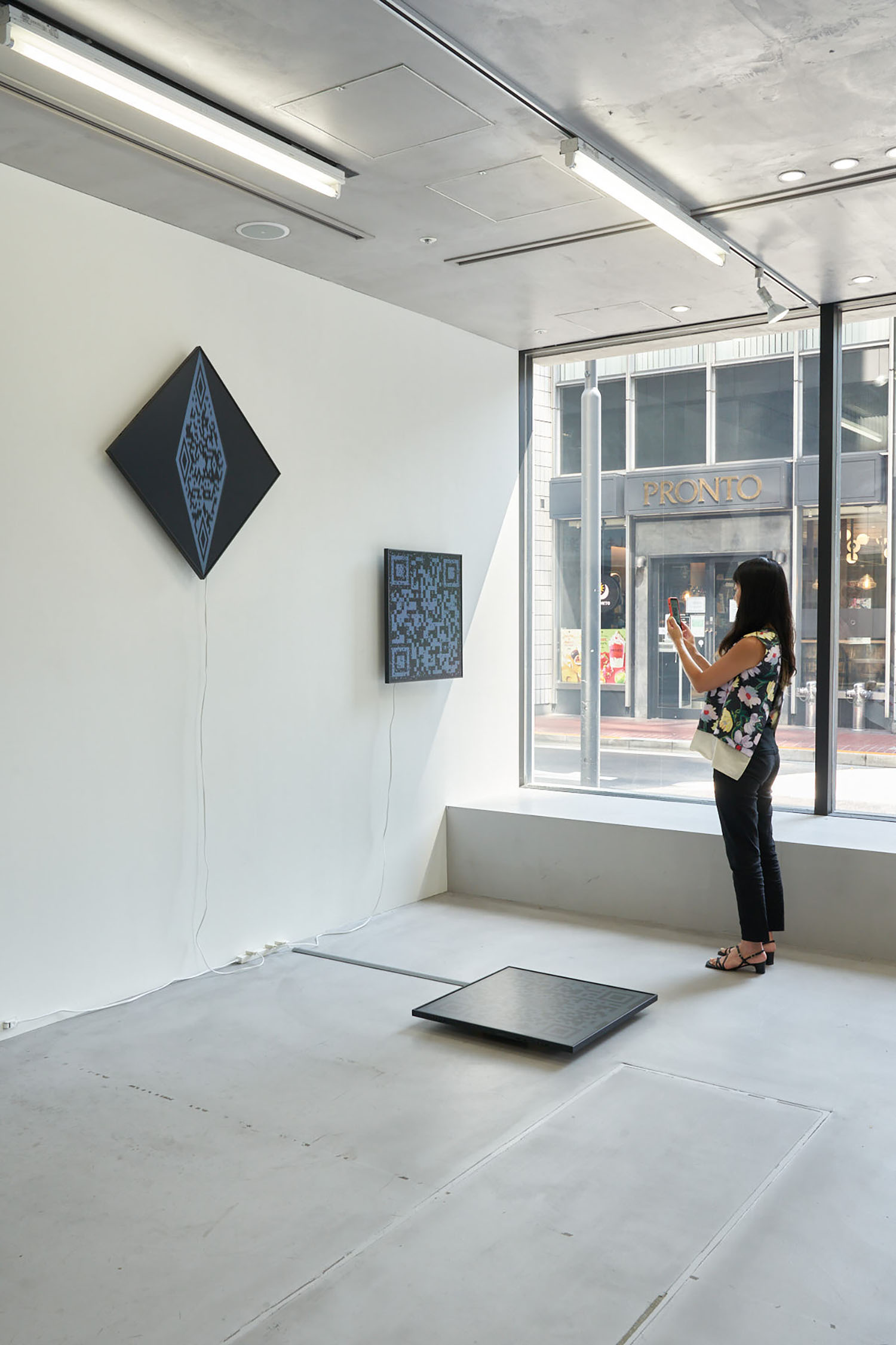 In this exhibition, we will exhibit and sell the “Crypto Poetry” series of NFT works, in which poems appear by reading the infinitely repeated QR codes. This work, which actively incorporates NFT production, can be said to be a work unique to exonemo, which lightly moves between online space and real space. The limited-edition version with an accompanying square-shaped monitor that will be exhibited in this exhibition will create the effect of a QR code suddenly appearing in real space. This will be the first time for CADAN YURAKUCHO to exhibit/sell NFT works.