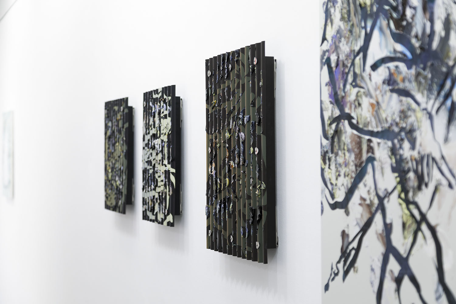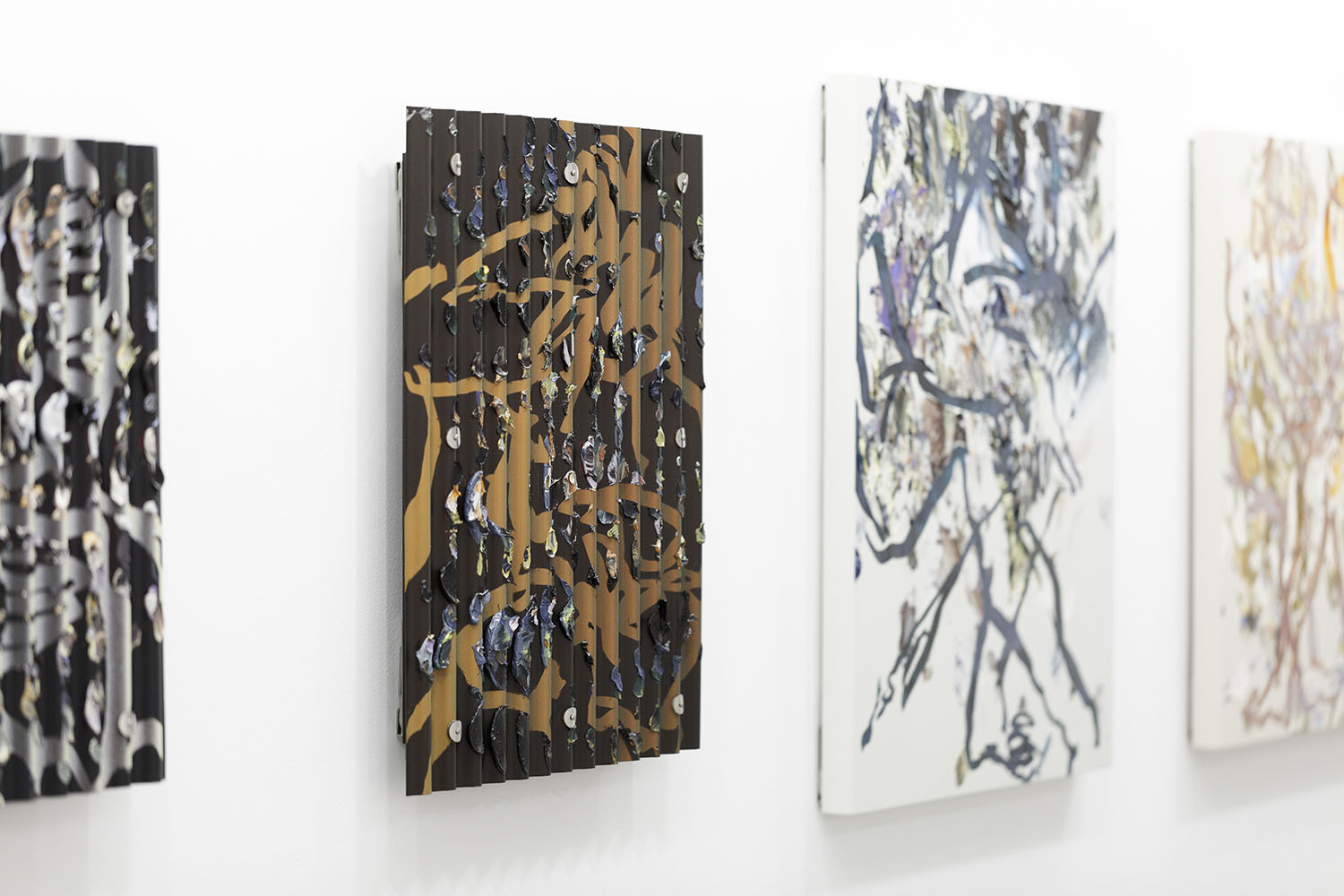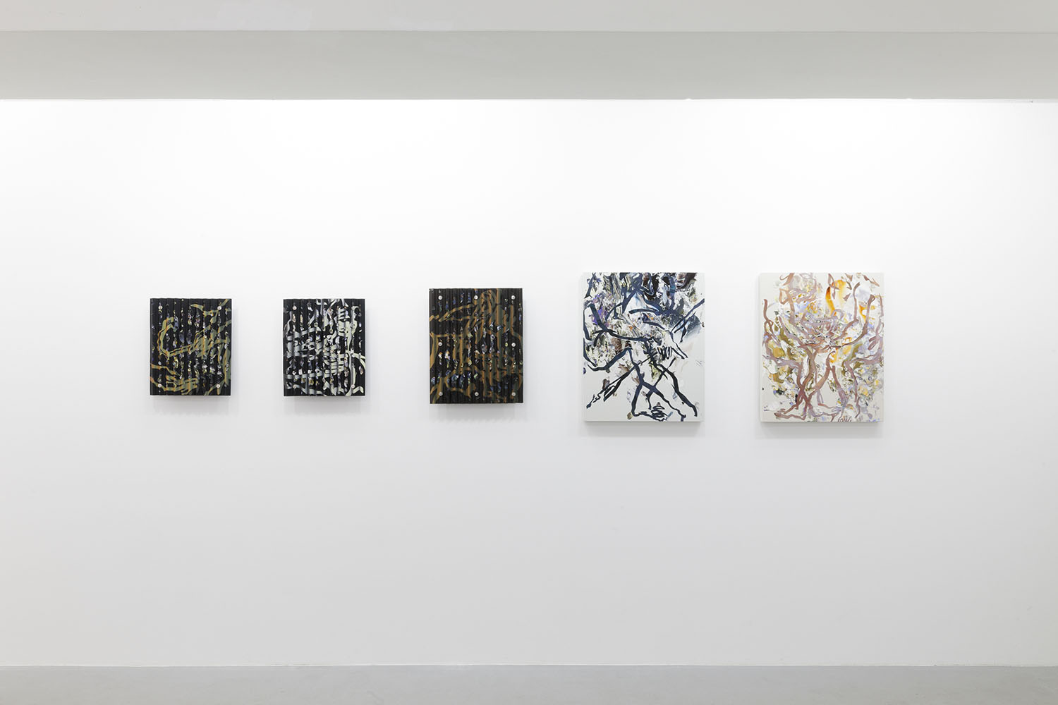 Left: “They / w”, 2023, acrylic, and oil on corrugated plastics sheeting, H425×W355mm