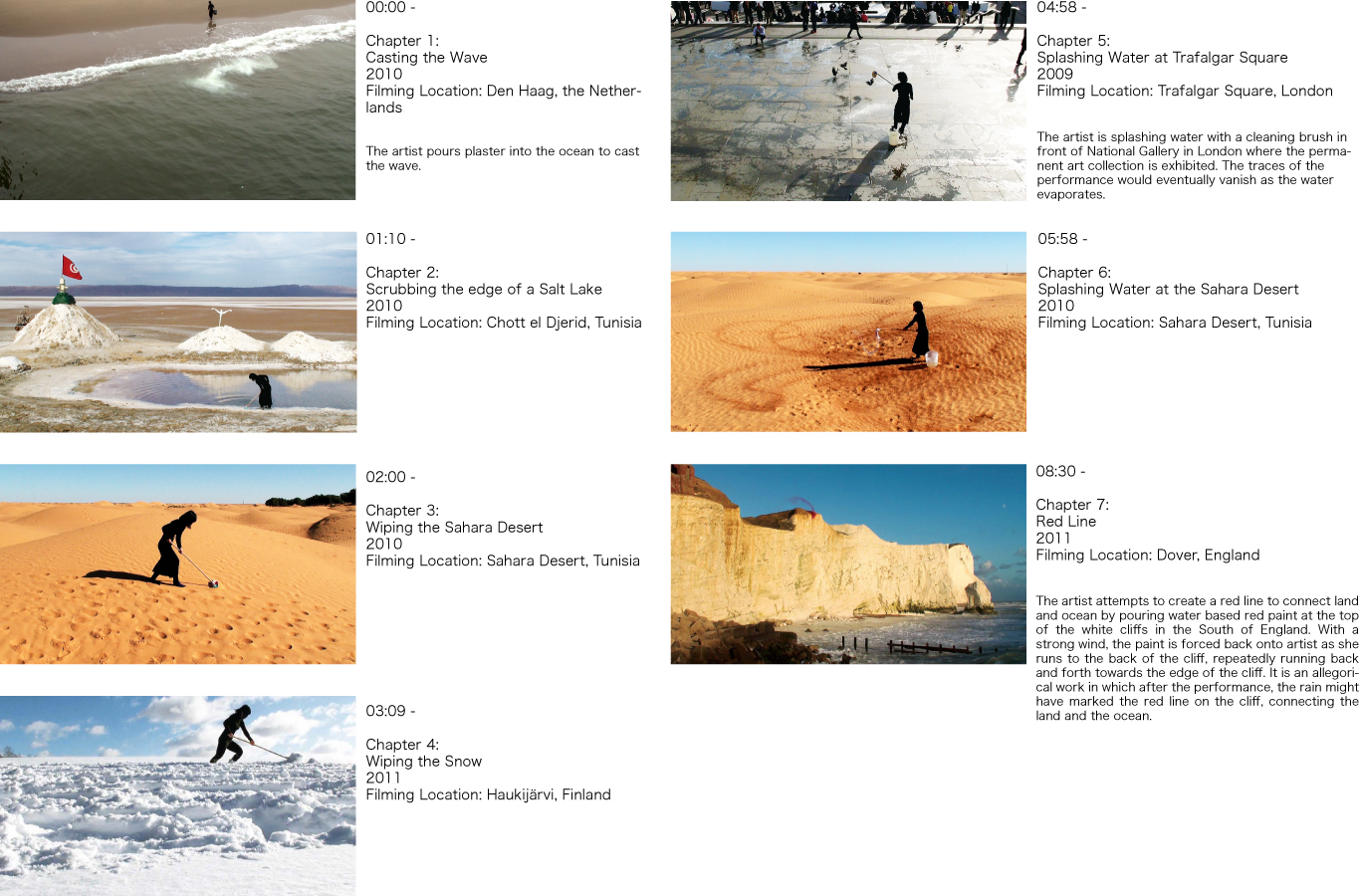 Secret Performance Series documents actions in which the artist, always a small, anonymous figure, makes subtle, insistent interventions in natural or built environments. The premise of the Secret Performance Series is that the performance happens only one time in a certain place on earth without any rehearsal and prior announcement. Those performance are often inspired by the place where the performance takes place and not repeatable like the life itself but kept only in a looped video.