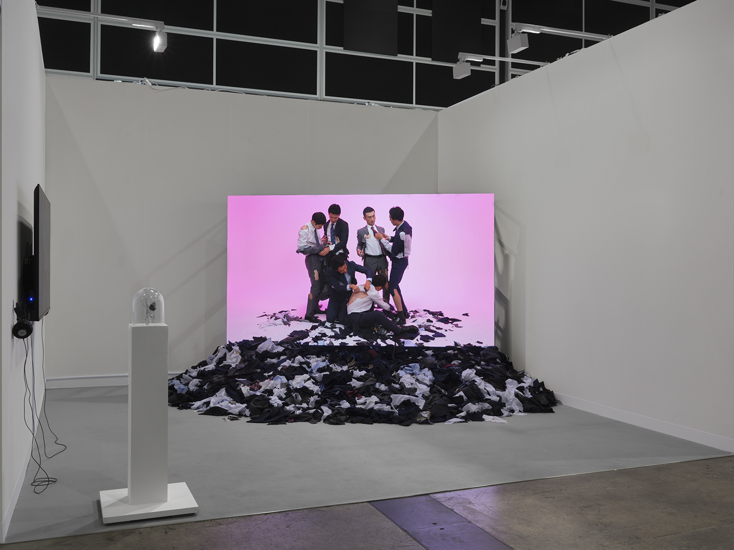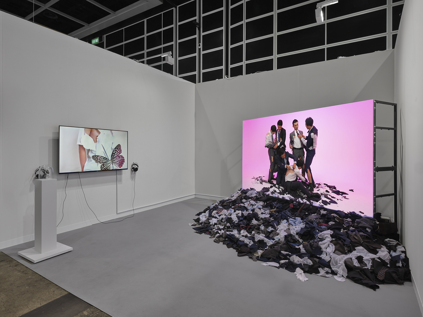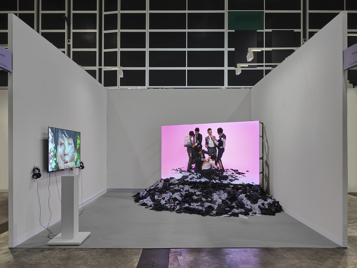 Art Basel Hong Kong 2024でのソロプレゼンテーションでは、2023年9月のWAITINGROOMでの個展で発表した最新作『Cut Suits』(2023)と『The Butterfly Dream』(2022)を、アートフェアのブースの中に再構成し展示します。作中で実際に使用した小道具を展示するほか、作中のイメージが展示空間まで広がったようなインスタレーション的表現など、映像作品をより空間的に展示いたします。