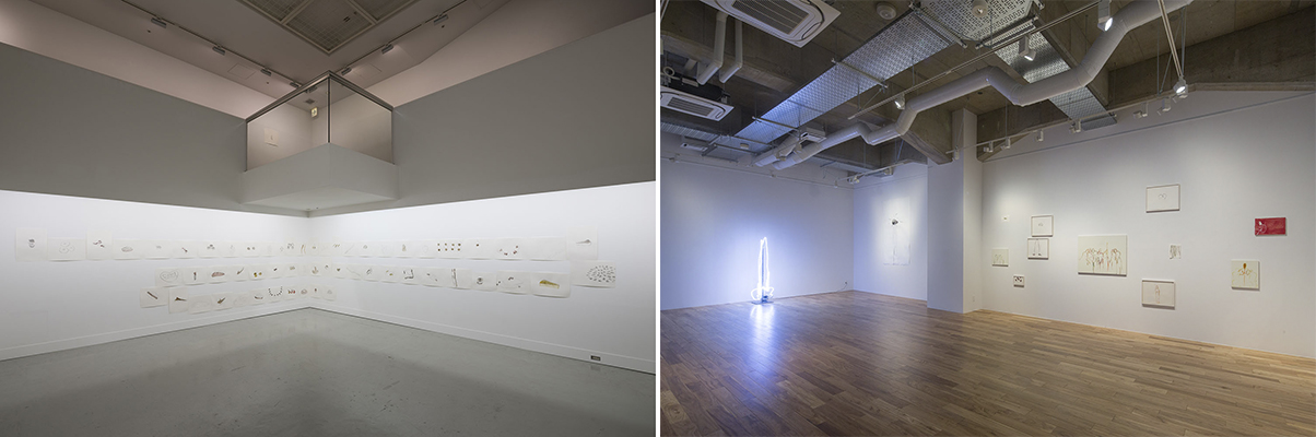 左:《SHISEIDO ART EGG vol.9 : Go down the throat》2015年、展覧会風景(資生堂ギャラリー・東京)撮影:加藤健