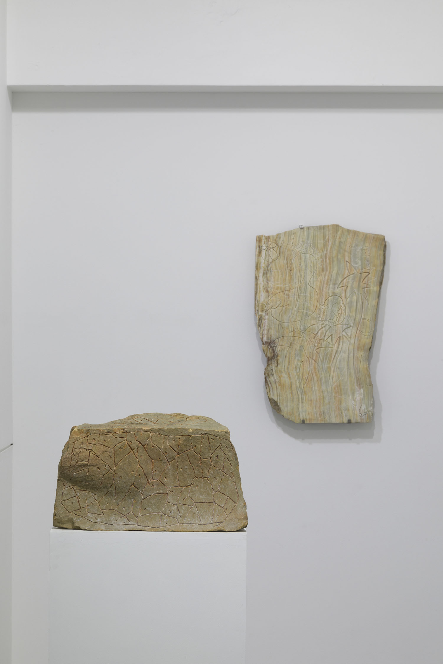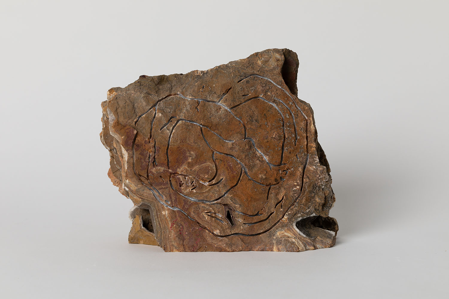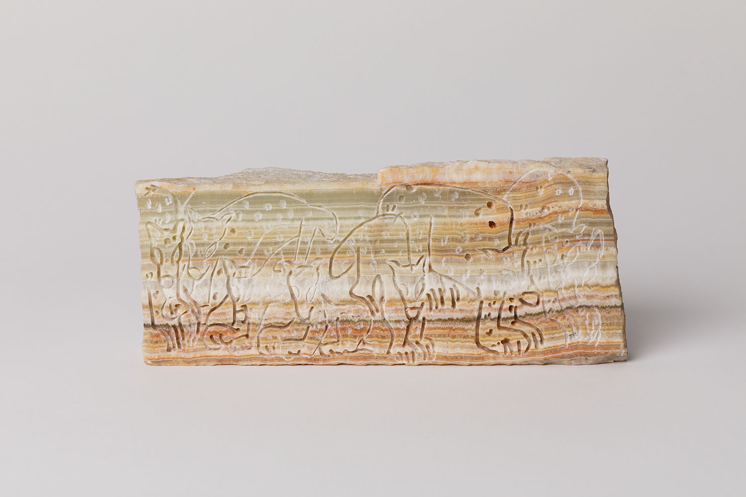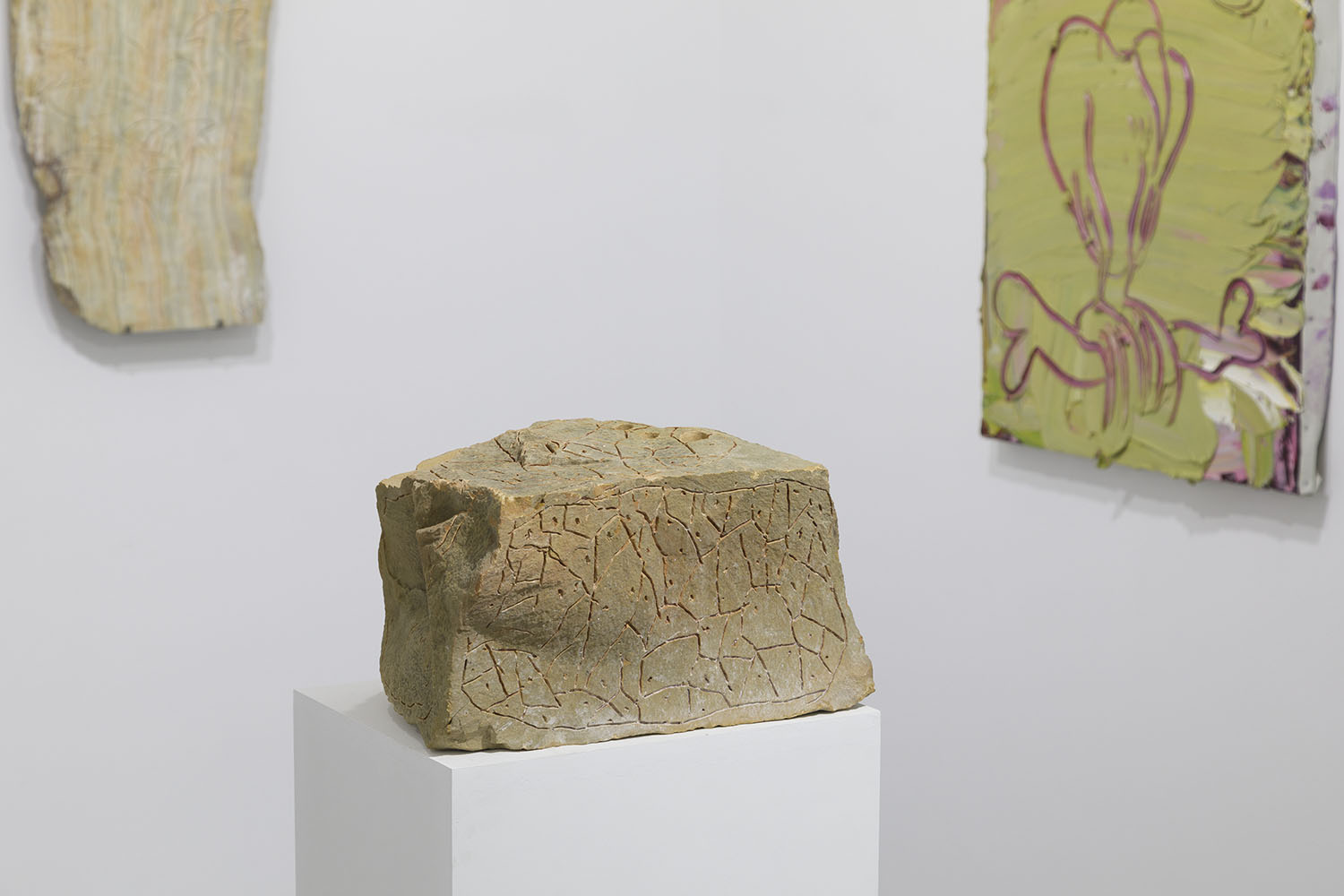 ドローイングだけで構成された展覧会で鮮烈なインパクトを残し、そのキャリアをスタートさせた川内理香子は、「線」とは、それを引いた者の身体性が最も如実に表れるものだといいます。「線には、その瞬間の身体の動きが、ひいては精神性までが表れるものだと思っています。自分の思考や身体は、日々刻々と状況の中で変化する流動的なものですが、私は線を引くことで、その瞬間の身体を作品の上に『凝固』させているという感覚があります」(松崎未来「30 ARTISTS U35 川内理香子 Rikako Kawauchi」、ARTnews JAPAN、2022年2月4日、https://artnewsjapan.com/30artists_u35/article/13)と語っているように、川内はその制作を通し、内部と外部、意識と無意識といった、捉え難い何かの境界や輪郭を探るように「線」を引きながら、それらをキャンバスや画用紙の上に留めようとしています。 本展で発表される新シリーズに用いられている大理石は、熱や大きな圧力が加わりながら、長い時間をかけて石灰岩が再結晶化したものです。その組成物であるサンゴなどの死骸は本来は白く、数万~数億年かけて石として生成する過程で、化学反応や熱による影響、石に含まれる鉱物や金属イオンなどの違いにより、様々な色や模様の違いが生まれます。大理石の表面に表れた天然の色や模様は、何万年という時間をかけて『凝固』してできたものなのです。 川内のペインティング作品の表面を見ると、厚塗りされた柔らかい油絵の具が乾いて固まる前に、その表面を削るように「線」を引き対象が描写されているということがわかります。川内の言う、流動している不確定なものが『凝固』して作品になるという感覚は、かかる時間の差異はあれど、石の成り立ちと似ていると言えるでしょう。そんな石の上に刻み込まれた川内の「線」は、ごつごつとした岩肌に「線」によって描かれた、芸術の始まりとも形容されるラスコーの洞窟壁画を彷彿とさせるかのようです。それらは共に発表されるペインティング作品と響き合い、「線を引く」という表現のもつ身体性や、プリミティブで本能的な側面を思い出させるでしょう。