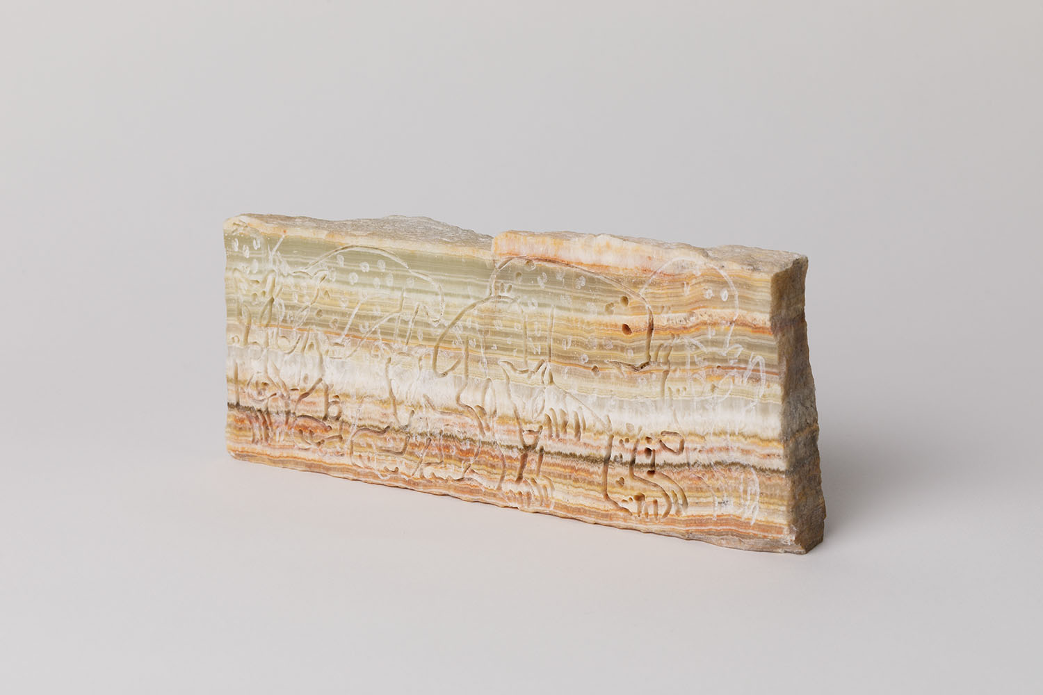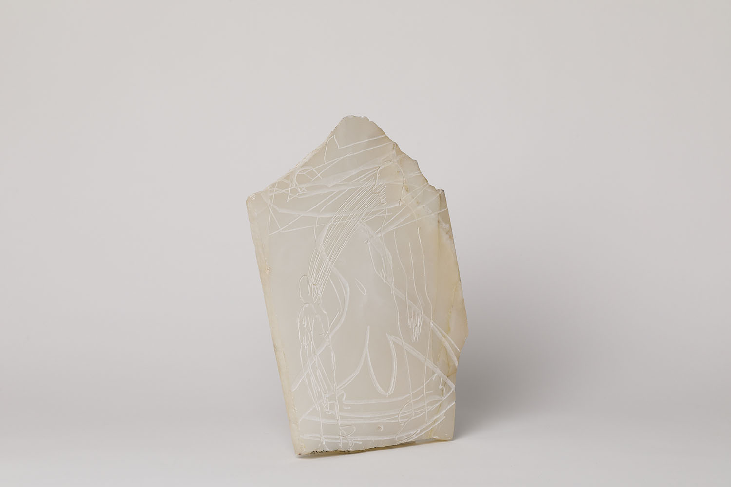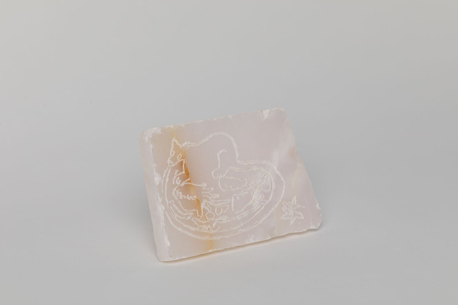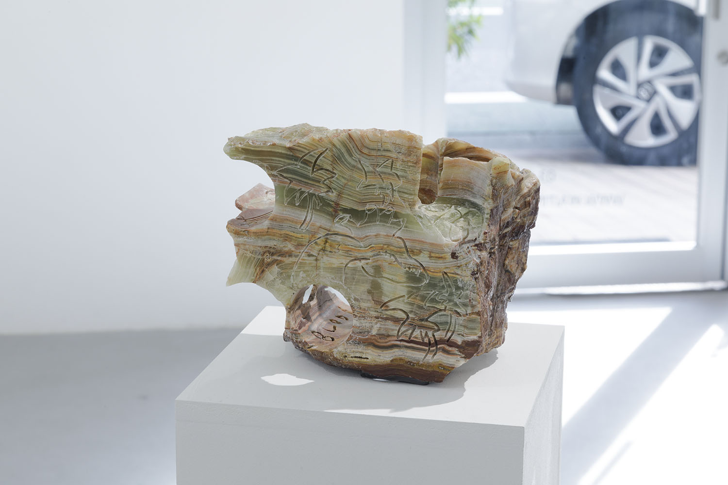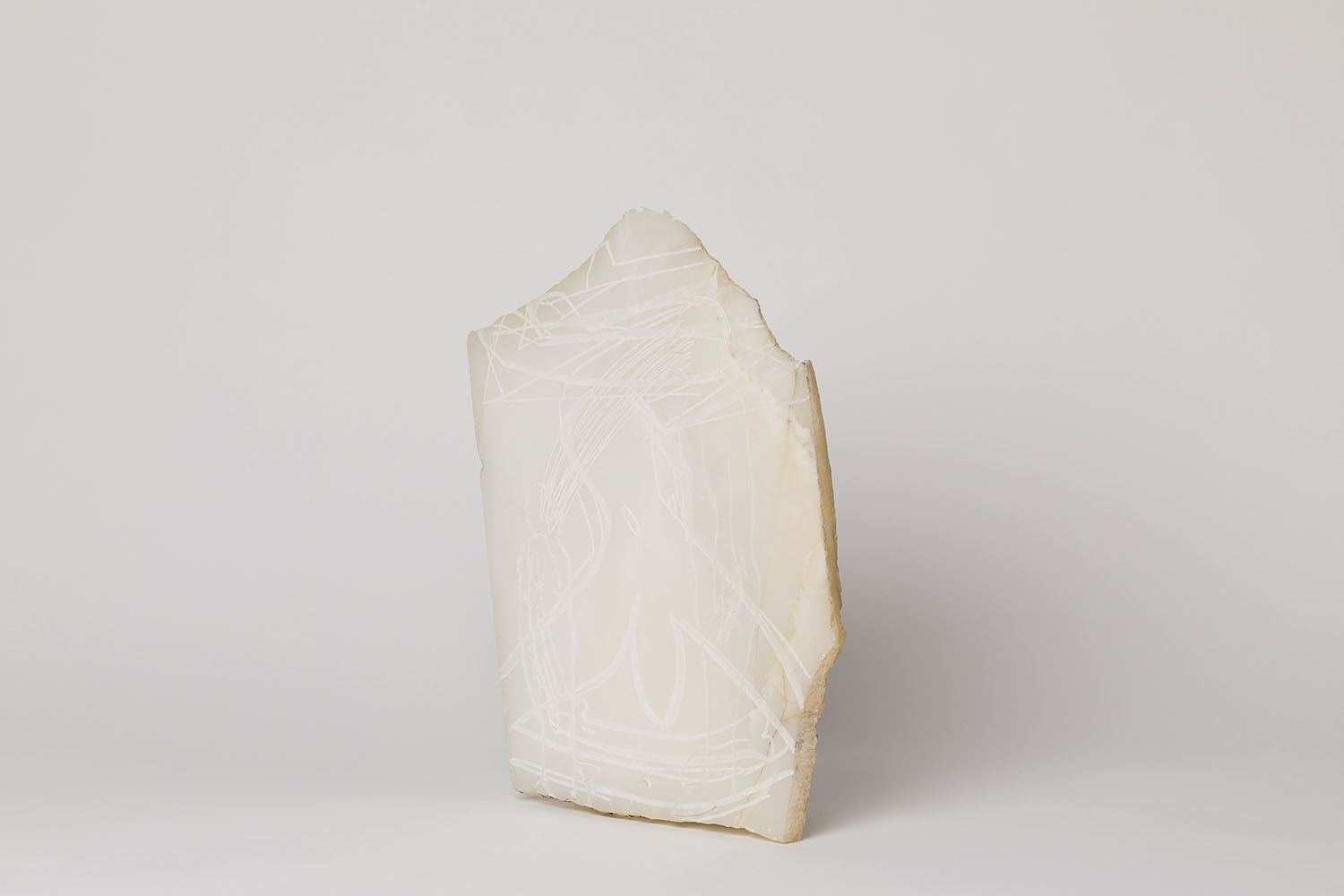 ドローイングだけで構成された展覧会で鮮烈なインパクトを残し、そのキャリアをスタートさせた川内理香子は、「線」とは、それを引いた者の身体性が最も如実に表れるものだといいます。「線には、その瞬間の身体の動きが、ひいては精神性までが表れるものだと思っています。自分の思考や身体は、日々刻々と状況の中で変化する流動的なものですが、私は線を引くことで、その瞬間の身体を作品の上に『凝固』させているという感覚があります」(松崎未来「30 ARTISTS U35 川内理香子 Rikako Kawauchi」、ARTnews JAPAN、2022年2月4日、https://artnewsjapan.com/30artists_u35/article/13)と語っているように、川内はその制作を通し、内部と外部、意識と無意識といった、捉え難い何かの境界や輪郭を探るように「線」を引きながら、それらをキャンバスや画用紙の上に留めようとしています。 本展で発表される新シリーズに用いられている大理石は、熱や大きな圧力が加わりながら、長い時間をかけて石灰岩が再結晶化したものです。その組成物であるサンゴなどの死骸は本来は白く、数万~数億年かけて石として生成する過程で、化学反応や熱による影響、石に含まれる鉱物や金属イオンなどの違いにより、様々な色や模様の違いが生まれます。大理石の表面に表れた天然の色や模様は、何万年という時間をかけて『凝固』してできたものなのです。 川内のペインティング作品の表面を見ると、厚塗りされた柔らかい油絵の具が乾いて固まる前に、その表面を削るように「線」を引き対象が描写されているということがわかります。川内の言う、流動している不確定なものが『凝固』して作品になるという感覚は、かかる時間の差異はあれど、石の成り立ちと似ていると言えるでしょう。そんな石の上に刻み込まれた川内の「線」は、ごつごつとした岩肌に「線」によって描かれた、芸術の始まりとも形容されるラスコーの洞窟壁画を彷彿とさせるかのようです。それらは共に発表されるペインティング作品と響き合い、「線を引く」という表現のもつ身体性や、プリミティブで本能的な側面を思い出させるでしょう。