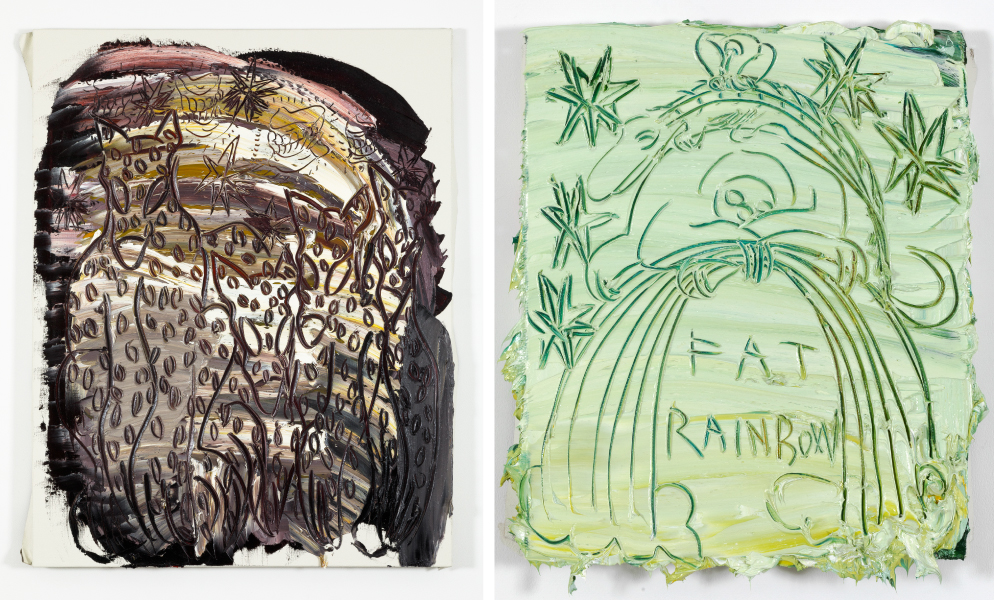 左:《gather at the riverbank》, 2023, oil on canvas, 1167 x 910 mm 右:《FAT RAINBOW》, 2023, oil on canvas, 455 x 380 mm