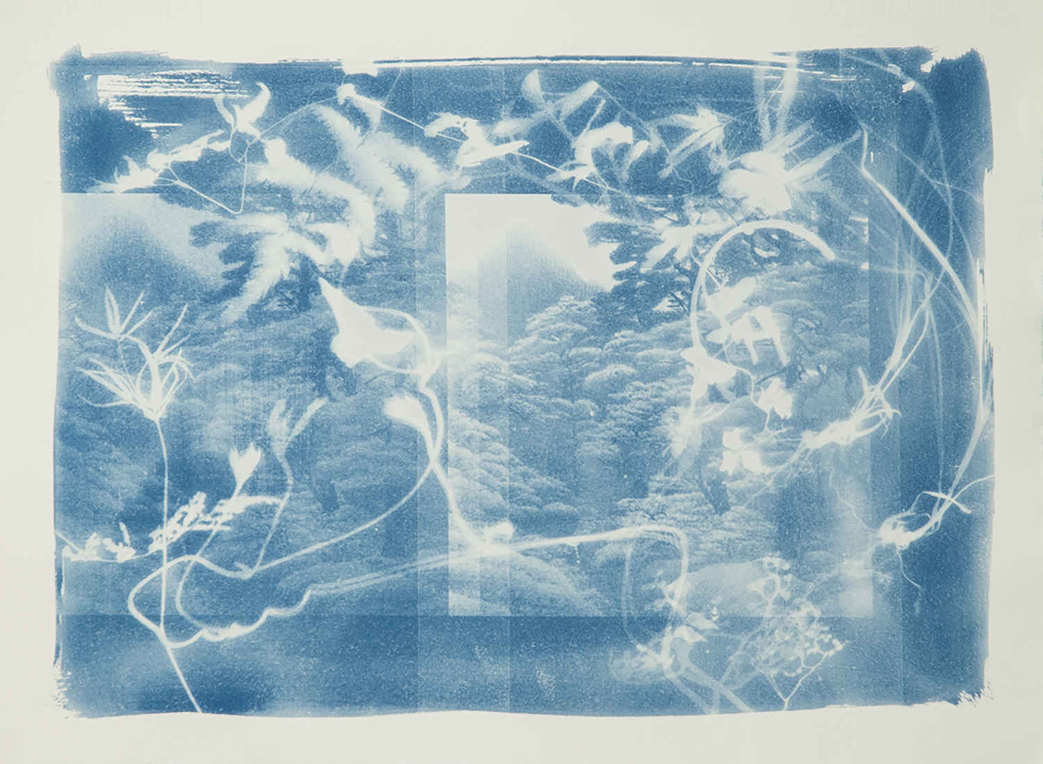 鮮やかな青色の発色を特徴とするサイアノタイプは、鉄塩の化学反応を利用した写真技法です。19世紀に発明された写真方式で、太陽光で印画することができるため、日光写真とも呼ばれます。三宅砂織はこの手法について「自分の作品を作る手法として取り入れ始めたのは、新型コロナウイルスの感染拡大で“外出自粛”をしていた時期です。室内に閉じこもっていたことから、屋外の環境や自然への意識が高まっていました。暗室の外へ出て、太陽の光でプリントすることが、個人的な癒しでもありました。」(『版画芸術』2022年春号 (No.195)、pp.26–33)と語っています。新型コロナウイルス感染症が猛威を奮ったこの数年間、三宅は、岐阜県美術館や石川県珠洲市、長野の山荘で滞在制作を行ないました。庭園や森林など、自然物と人工物が同居しながら形づくられた風景を眺めながらあてもなく歩く中で、テクノロジーが私たちと自然との関わりや理解をどう変えてきたのか、また、そうした環境変化の中で、アートはどのように存在するのかについて、より深く考えるようになったといいます。