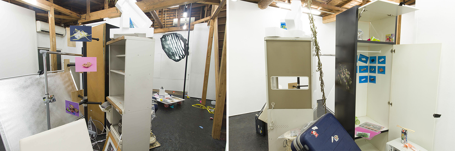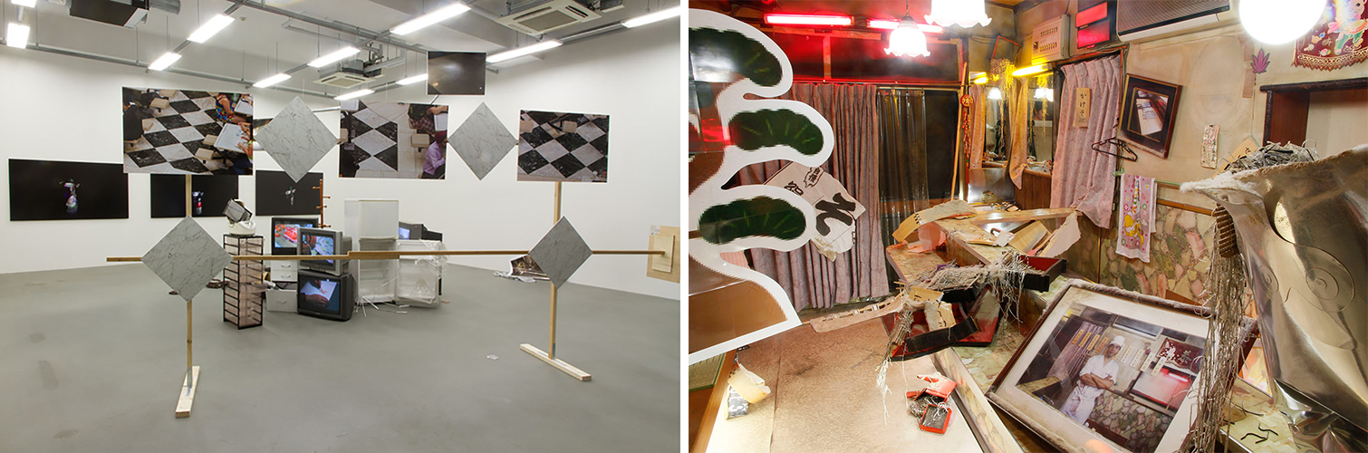 (左・右)個展『公共と自由』展示風景(2016年、Art Center Ongoing、東京)、ミクストメディアインスタレーション、サイズ可変