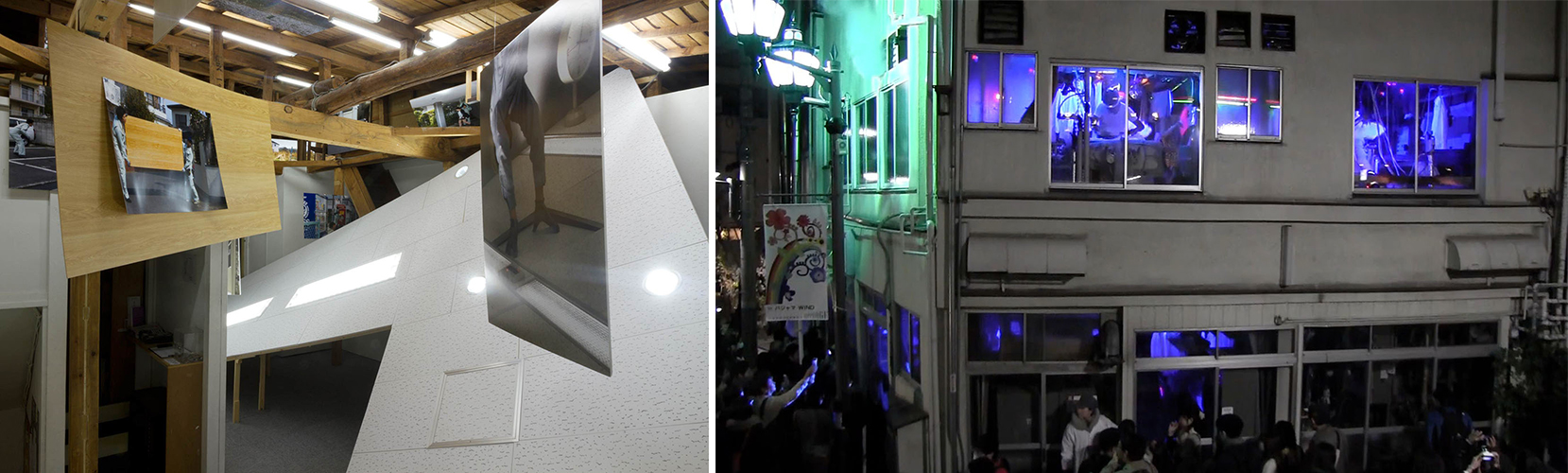 右:『昨日の準備』展示風景(2010年、黄金町バザール、神奈川)、ミクストメディアインスタレーション、サイズ可変