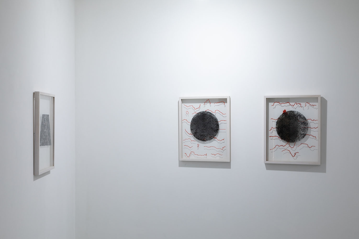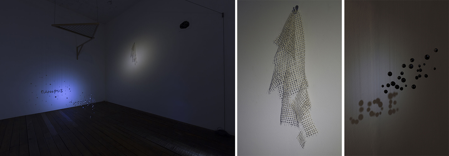 (中央)『Solaris』2016年、スタニスワフ・レムの小説『惑星ソラリス』(1961年)の中の「 I 」、リネンの糸、製本のり、650 x 200 x 150 mm