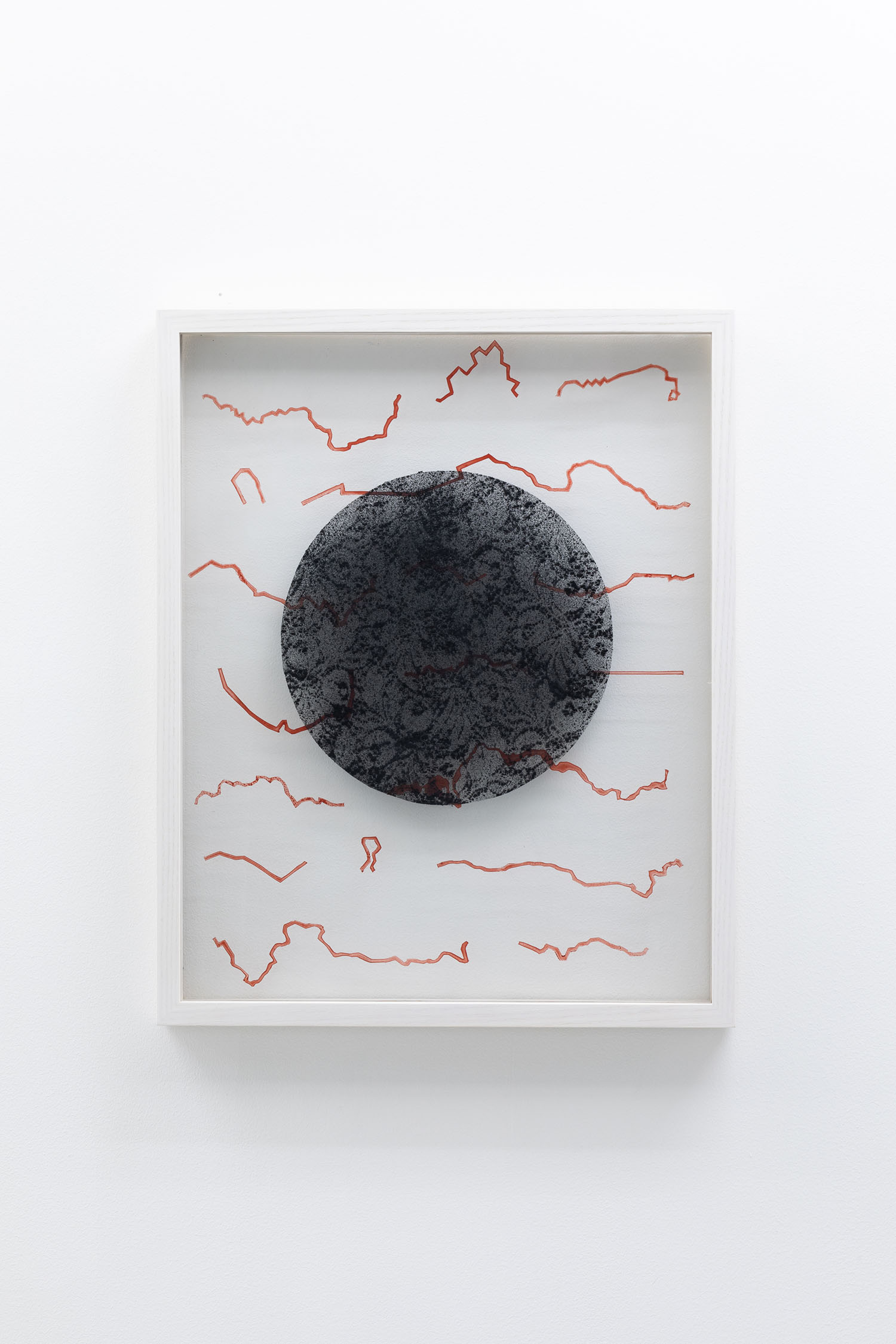 (右)『Meteorit #5』2016年、木炭、アクリルラッカー、ガラス、300 x 300 x 30 mm
