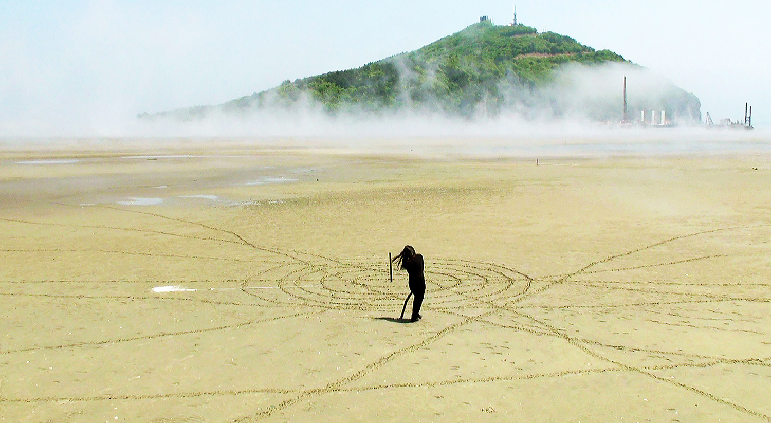 北朝鮮に近接する韓国の島 白翎島(ペンニョンド)(英語表記:Baengnyeongdo)で行なったパフォーマンスビデオ。満ち引きで潮が引いた砂浜で行ったパフォーマンスで、中央に立つ棒を一人の人間と見立て、その周辺の国境や分断線などの境界線について思考する作品です。棒を中心に線を描いていき、その上に円を描いていきます。