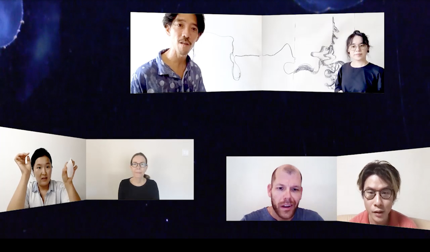 川辺はこのプロジェクトに、遠く離れた場所に住む6人のアーティストを招待しました。 Jane Brucker (ヴィジュアル・アーティスト、カリフォルニア)、Miss Hawaii(ミュージシャン、岩手)、Henrik Malmström(写真家、ブエノスアイレス)、Setbyol Oh(照明デザイナー、ベルリン)、Ziyun Wang(画家、広州)、山洋平(画家、ホーチミン)です。2人の人物の「出会い」のビデオが3バージョン制作され、すべてのビデオを同時再生したバージョンをここで上映しています。オンラインのコミュニケーションツールで接続されたアーティストたちは、事前にゲームのルールについて知らされていましたが、それまでお互いに全く知らない者同士でした。