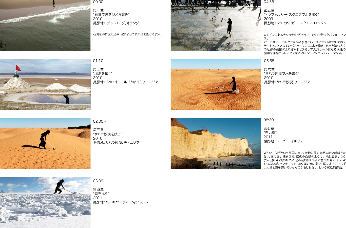 シークレット・パフォーマンス・シリーズは、アーティスト自身が画面の中に小さく無名な人物として登場し、自然や建築物の環境へ、微細かつ連続的な行為で介入する行為を記録した作品です。リハーサルおよびアナウンス無しで、地球上のとある場所で一度だけ行われるパフォーマンスであることが条件です。それらのパフォーマンスは、しばしばパフォーマンスが行われる場所とともに作り上げられ、人生そのもののように再現可能ではなく、ループしたビデオにのみ保存されます。